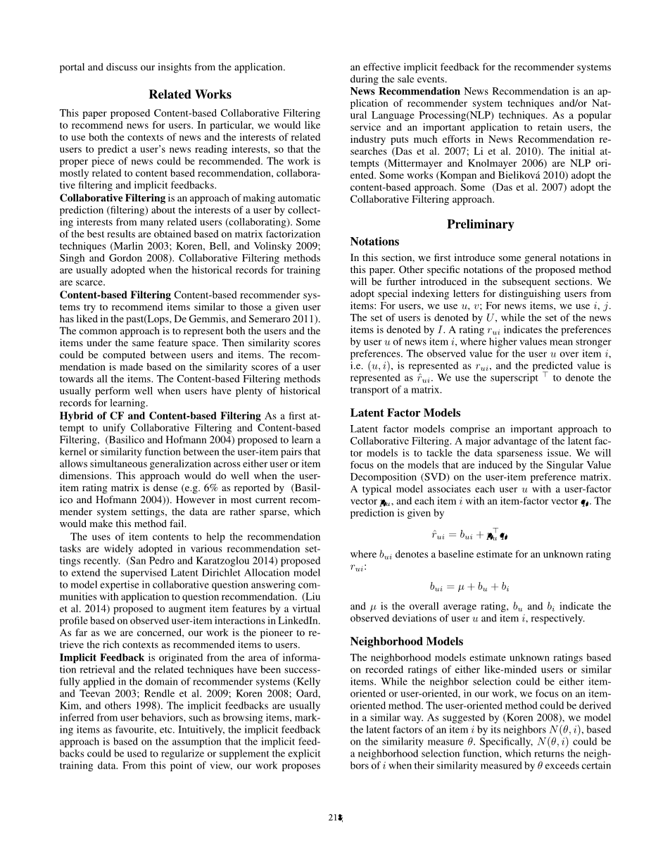 新闻推荐是推荐系统技术又或者是自然语言处理(NLP)技术的应用。作为一项受欢迎的服务和留住用户的重要应用程序,业界在新闻推荐再搜索方面投入了大量的精力(Das et al. 2007; Li et al. 2010). 最初的尝试(Mittermayer and Knolmayer 2006) 是面向NLP的。一些作品(Kompan and Bielikovaacute; 2010) 采用基于内容的方法。一些(Das et al. 2007) 采用了基于协同过滤的方法。