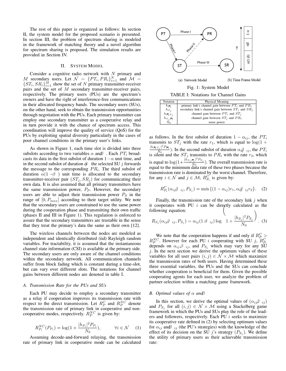 本文的其余部分安排如下:在第二节,拟议方案的系统模型。在第三节对匹配理论和频谱共享的问题,提出了频谱共享新算法的框架模型。仿真结果在第四节提供。