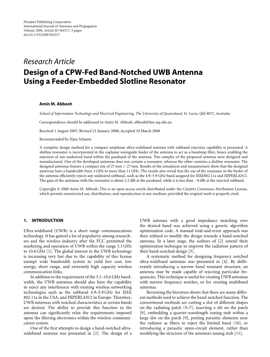 Correspondence should be addressed to Amin M. Abbosh, abbosh@itee.uq.edu.au Received 1 August 2007; Revised 21 January 2008; Accepted 10 March 2008 Recommended by Hans Schantz