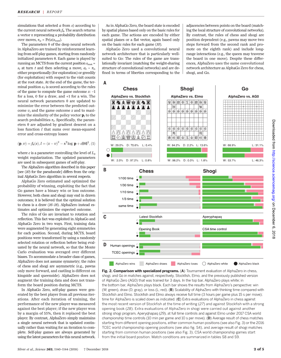 在1997年实现人工智能的里程碑,当时深蓝击败了人类世界国际象棋冠军(1)。在接下来的二十年里,计算机国际象棋程序继续稳步地超越人类水平。这些程序通过使用手工制作的功能和精心调整的权重来评估位置,由强大的人类玩家和程序员构建,再加上高性能的alpha-beta搜索,通过使用大量聪明的启发式方法和特定领域的适应性来扩展一个庞大的搜索树。在(10)中,我们描述这些增强,重点是2016年顶级国际象棋引擎锦标赛(TCEC)第九季世界冠军斯托克菲斯(11);其他强大的国际象棋程序,包括深蓝,使用非常相似的架构(1,12)。
