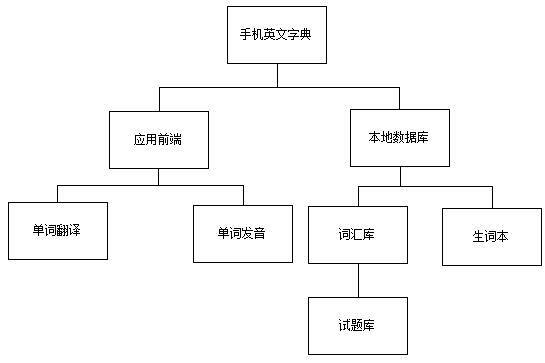 手机英语词典主要为学生提供英语学习服务,用户使用词典可以查询单词中文释义,创建生词本,删除生词本,管理词库等,分组模块分别为:汉译英,单词记忆,生词发音,到时学习提醒,词汇库管理,单词考察6个模块。应用功能总体结构图如图2.1所示: