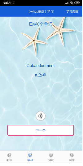 (3)单词学习界面,用户可以学习生词,生词可以发出标准读音,同时记录用户已学单词的个数。
