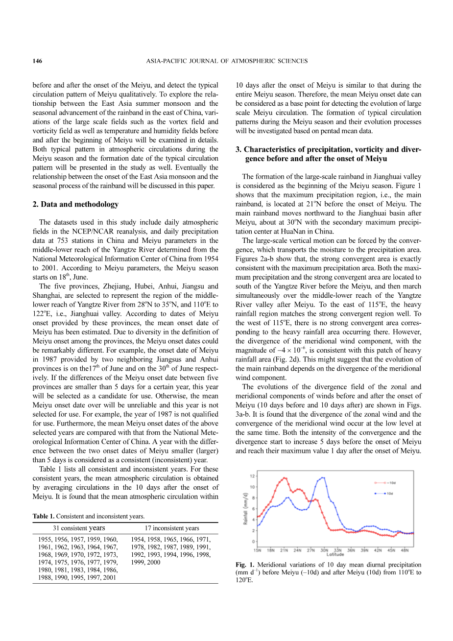江淮流域大型雨带的形成被认为是梅雨季节的开始。 图1显示梅雨发生前的最大降水区域,即主雨带,位于21o N。梅雨之后主要的雨带向北移动到江淮盆地,大约在30oN位于中国华南的次级最大降水中心。