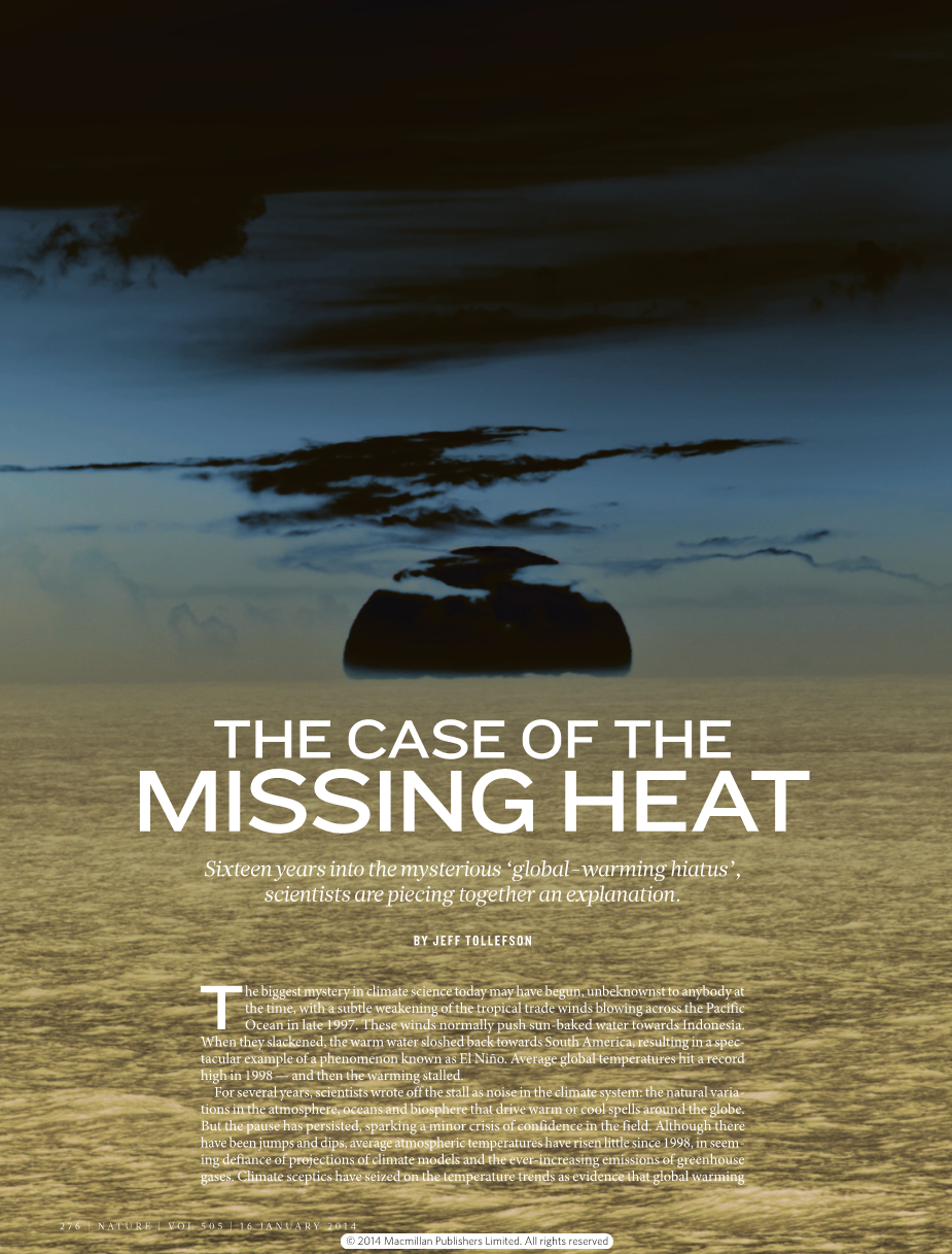 几年来,科学家们一直将这种停滞视为气候系统中的噪音:大气、海洋和生物圈的自然变化,推动着全球的冷暖周期。但这种停滞仍在持续,引发了该领域的一场小规模躁动。尽管有跳跃和下降,平均气温自1998年以来几乎没有上升,这似乎违背了气候模型的预测和温室气体排放量的不断增加。气候怀疑论者抓住气温变化趋势作为全球变暖已经停止的证据。 与此同时,气候学家们知道,热量肯定仍在气候系统的某个地方积聚,他们一直在努力解释,如果热量没有进入大气层它将流向何处。一些人开始怀疑他们的模型是否有问题。