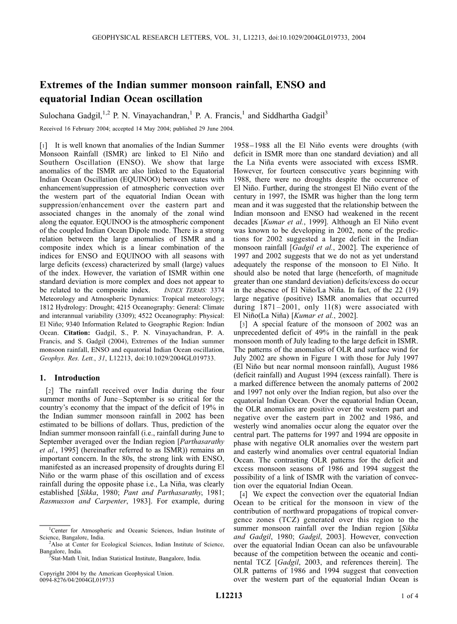 Sulochana Gadgil,1,2 P.N.Vinayachandran,1 P.A.Francis,1 and Siddhartha Gadgil3