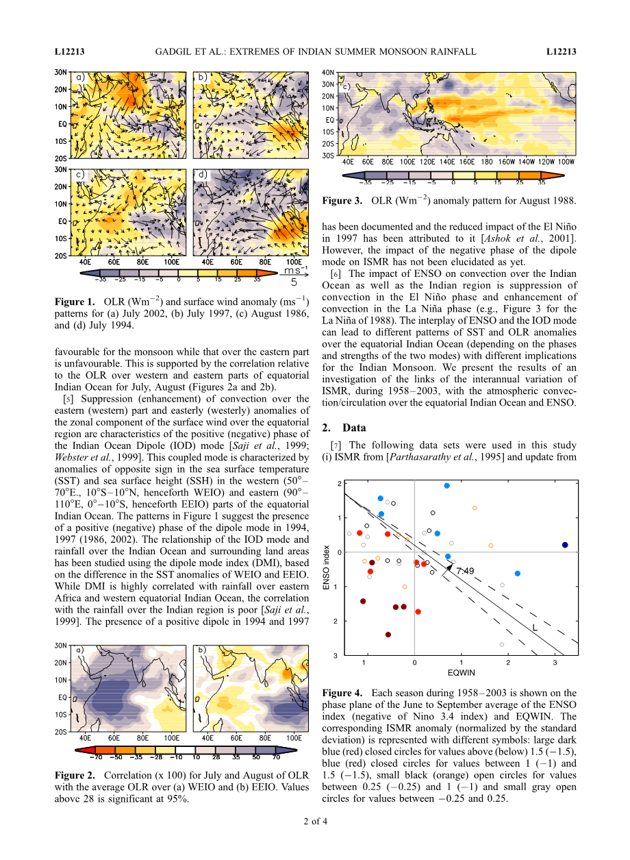ENSO对印度洋及印度地区对流的影响是其抑制了厄尔尼诺期的对流,并加强了拉尼娜期的对流(如图3所示的1988年拉尼娜现象)。ENSO与IOD模式的相互作用可能导致赤道印度洋SST和OLR异常的不同模式(取决于两种模式的位相和强度),同时对印度季风产生不同影响。本文给出了对1958-2003年ISMR年际变化与赤道印度洋和ENSO间大气对流/环流之间联系的研究结果。
