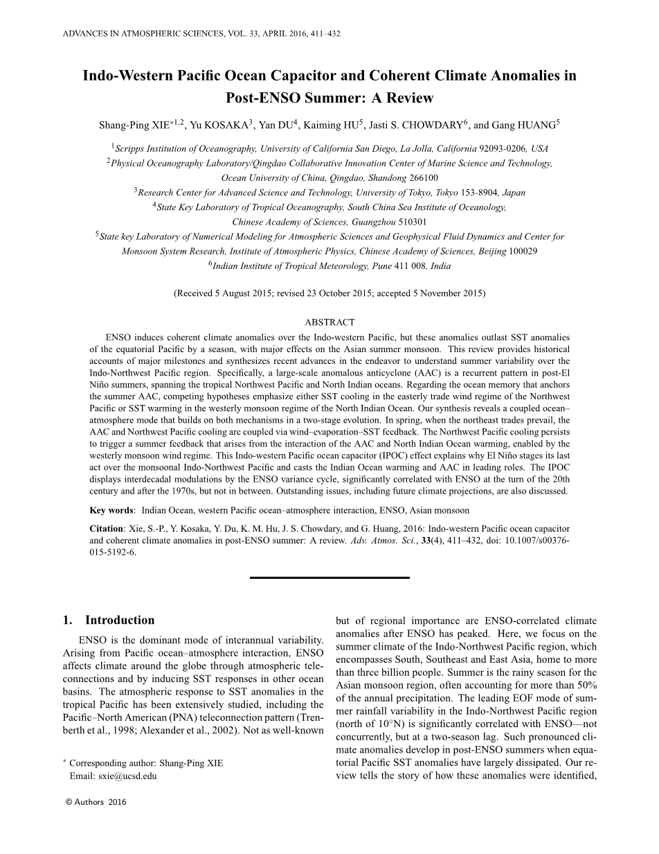 ENSO是年际变化中的主导模式。由于太平洋海气相互作用,ENSO通过大气的遥相关引起其它洋盆海表温度的响应,以此影响全世界的气候。在大气响应造成的热带地区海表温度异常这方面已经有了大量的研究,包括太平洋-北美遥相关模式(Trenberth 等人1998;Alexander等人2002)。并不出名但是却对某些区域很重要的是和ENSO相联系的在ENSO达到顶峰之后的气候异常。这里我们关注的是印度西太平洋地区的夏季气候,它控制着南亚、东南亚、东亚地区,有着超过三十亿的人口。对亚洲夏季风区而言,夏季是雨季,这一时期的降水量占全年
