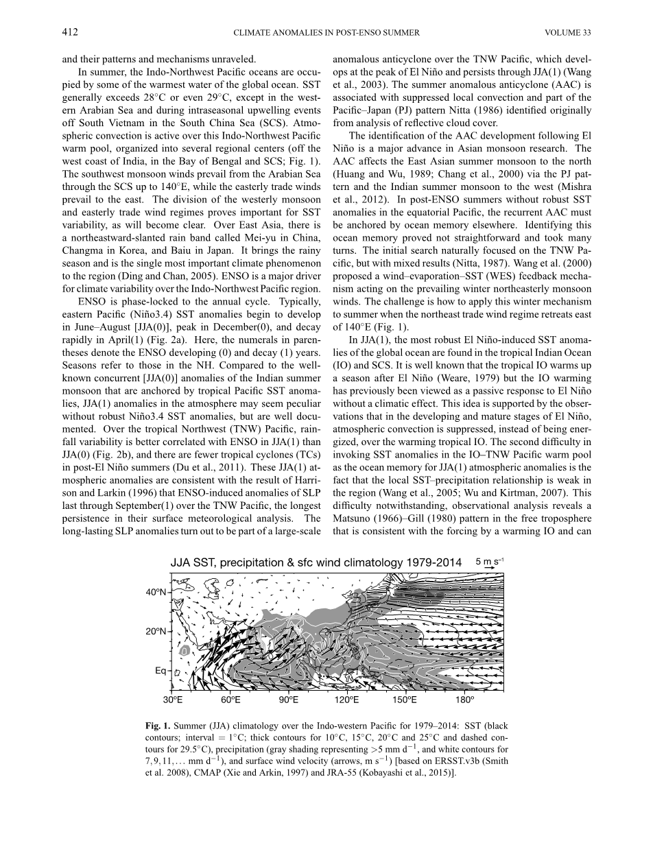 夏天,全球海洋的暖水占据了印度西北太平洋。在不考虑西部阿拉伯海和这期间在越南南部的中国南海的季节内涌升事件时,印度西北太平洋的海表温度会逐渐升高到28℃甚至29℃。在印度西北太平洋暖池有几个区域的大气对流活动中心。(在印度西海岸、孟加拉湾和中国南海;图1)从阿拉伯海穿过中国南海到达140°E有西南夏季风盛行,而此时其东部为偏东信风。西部季风区和东部信风区对于海表温度的变化很重要,而且这将会变得很清晰。在东亚上空,有一东北向的雨带,在中国称它为梅雨,在韩国称它为Changma,在日本称它为Baiu。它会带来雨季而且是东亚地区最重要的一个天气现象。ENSO是印度西北太平洋地区气候变化的主要驱动力。