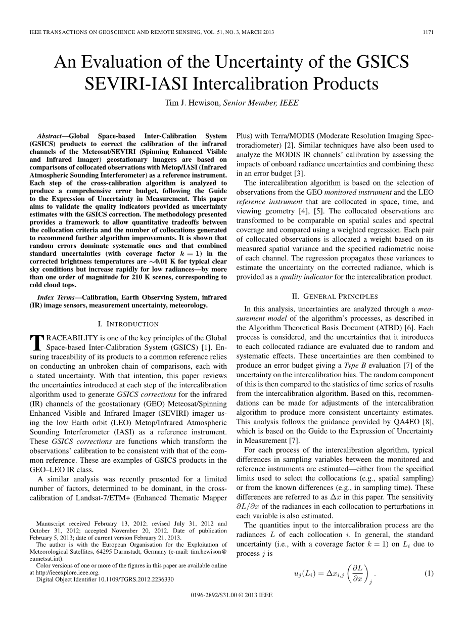 由于每个像素的确切地理定位误差未知,我们假设它们均匀分布在其导航所引用的精度上。基于操作图像处理设施处理的SEVIRI 1.5级图像的图像导航(校正)的典型精度计算为1.2 km [11]。IASI 1c级数据的地理定位精度计算为1-2 km [12]。假设这些误差在经度和纬度之间平均分配。它们的不确定度线性组合起来作为保护带,因此假设纵向位置误差均匀分布在,这相当于标准不确定度。将匹配辐射对经度中的系统误差的灵敏系数计算为目标域上的Meteosat-9图像的相邻像素之间的辐射的平均差。纬度地理定位误差与生成GEO-LEO匹配的大多数域中的经度非常相似。然而,由于纬度温度和湿度梯度,辐射对纬度误差比经度更敏感。