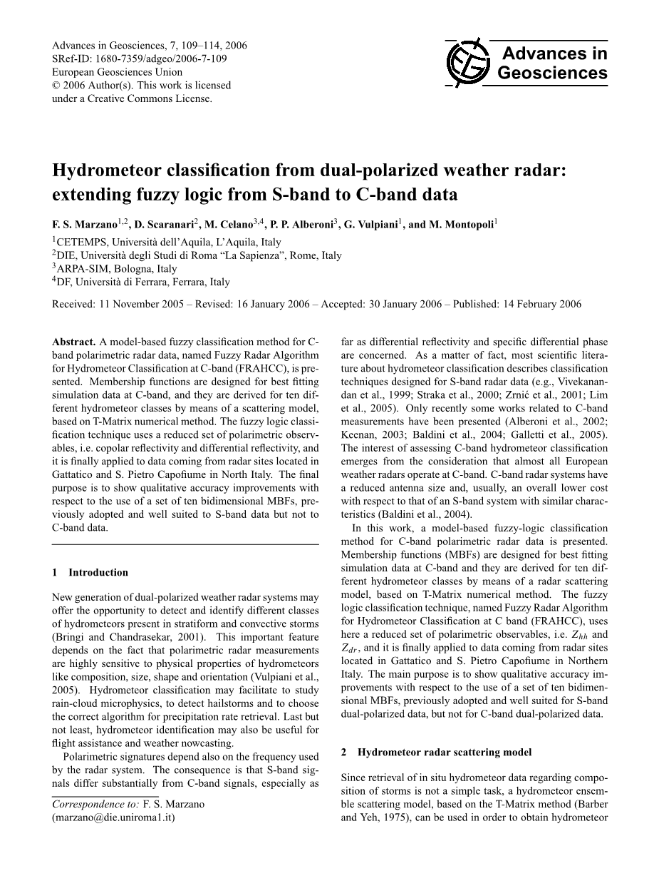 摘要:针对C波段极化雷达数据提出了一种基于模型的模糊分类方法-C波段降水分类模糊雷达算法(FRAHCC)。为C波段模拟数据设计了最佳拟合方法,并利用散射模型,基于T矩阵数值方法,导出了10个不同降水类型的模拟数据。模糊逻辑分类技术使用了一组简化的极化观测数据,即水平反射率和差分反射率,并最终应用于位于意大利北部的Gattatico和S.Pietro Capofiume的雷达数据。最终目的是在使用10组二维MBFs方面显示出质量精度的提高,这是以前采用的,非常适合S波段数据,但不适用于C波段数据。