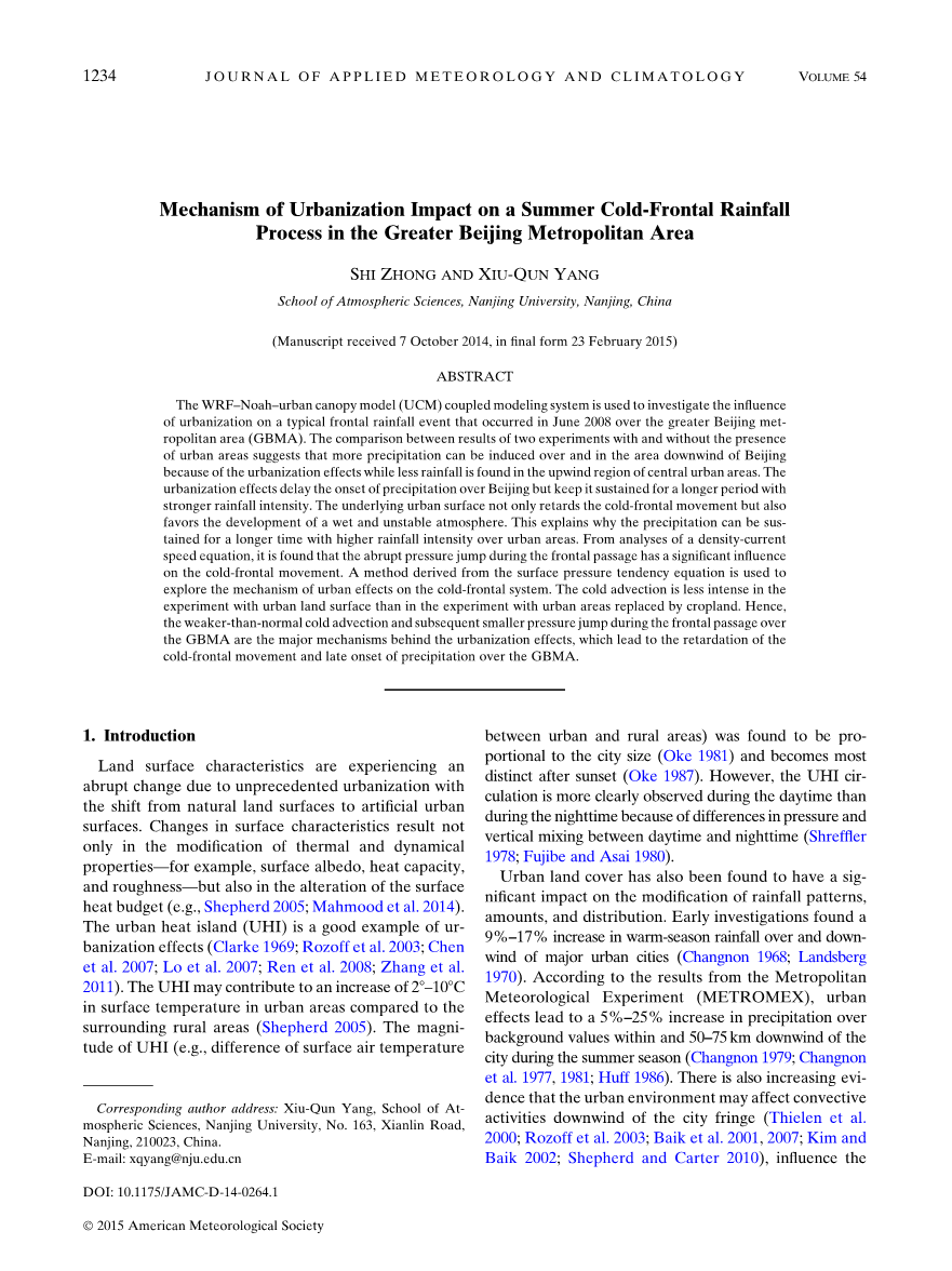 城市化对北京市区夏季冷锋降水过程的影响机制外文翻译资料