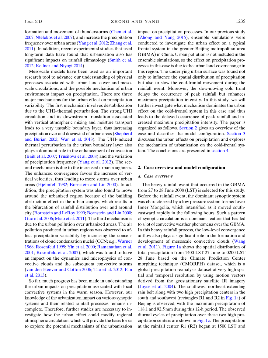 在我们先前的研究中(Zhong 和Yang 2015),我们用整体模拟的方法研究了中国北京大都市区的一个典型锋面系统的城市效应。城市污染不包括在集合模拟中,因此在这种情况下对降水过程的影响是由于该地区的城市土地覆盖变化所致。下垫面不仅影响降水的空间分布,而且减缓降水过程中的冷锋运动。下垫面不仅影响降水的空间分布,而且减缓降水过程中的冷锋运动。此外,缓慢移动的冷锋延迟了峰值降水的发生,但增加了最大降水强度。在本研究中,我们将进一步探讨此案例中城市对冷锋系统的影响从而导致高峰降水的延迟发生和最大降水强度的增加的主导机制。这篇论文组织如下。第二节对案例进行了概述,并对模型配置进行了描述。第三节探讨了城市对降水的影响,并探讨了城市化对冷锋系统的作用机理。结论见第4节。
