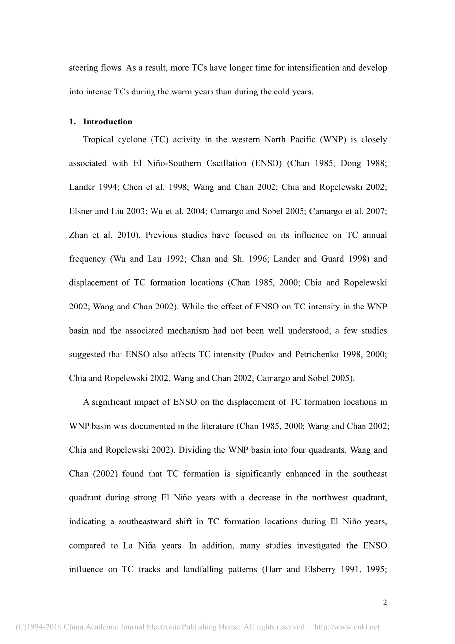 西北太平洋(WNP)的热带气旋(TC)活动与厄尔尼诺—南方涛动(ENSO)密切相关(Chan 1985; Dong 1988; Lander 1994; Chen et al.1998; Wang and Chan 2002; Chia and Ropelewski 2002; Elsner和Liu 2003; Wu等人2004; Camargo和Sobel 2005; Camargo等人2007; Zhan等人2010)。以前的研究集中在它对TC年频率的影响(Wu和Lau 1992; Chan和Shi 1996; Lander and Guard 1998)和TC形成位置的位移(Chan 1985,2000; Chia和Ropelewski) 2002;王和陈2002)。而ENSO对WNP盆地中TC强度的影响及其相关机制尚未得到很好的理解,一些研究提出ENSO也影响TC强度(Pudov和Petrichenko 1998,2000; Chia和Ropelewski 2002, 王和陈2002;Camargo和Sobel 2005)。