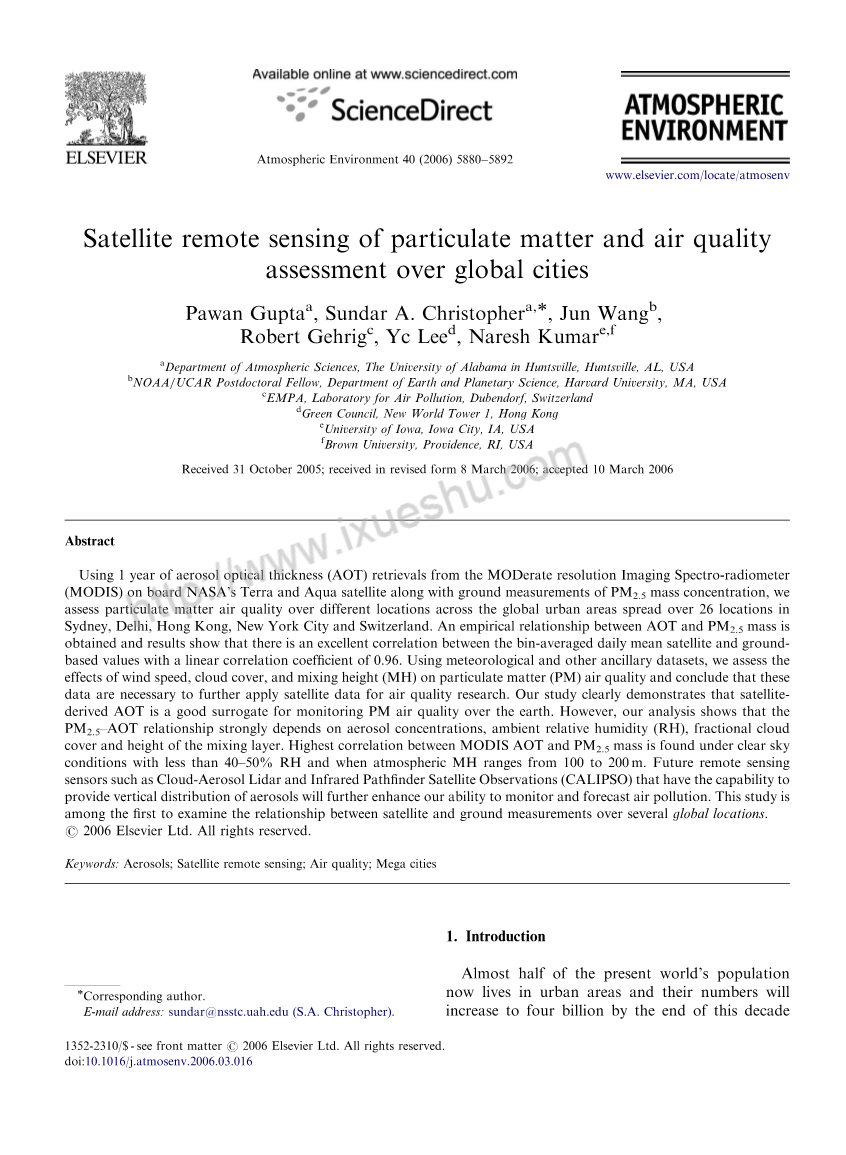 摘要:从中分辨率成像光谱仪获取1年的NASA的Terra和Aqua卫星上的MODIS AOT数据,以及地面监测的PM2.5质量浓度,我们评估分布在全球的26个城市地区,包括悉尼、德里、香港、纽约和瑞士的颗粒物空气质量,得到了AOT与PM2.5质量之间的经验关系,结果表明,卫星反演的PM2.5质量浓度与地面监测的浓度的分组平均的日均值之间存在极好的相关性,线性相关系数为0.96。利用气象和其他辅助数据集,我们评估了风速、云量和混合高度(MH)对颗粒物(PM)空气质量的影响,证实这些数据是进一步应用卫星数据进行空气质量研究的必要条件。我们的研究表明,卫星获得的AOT是监测地球上PM空气质量的一个很好的替代品。然而,我们的分析表明PM2.5-AOT关系对气溶胶浓度、环境相对湿度(RH)、碎云层以及混合层的高度有很强依赖性。在晴空条件下,相对湿度小于40-50%,以及大气MH在100 - 200米范围内时,MODIS AOT与PM2.5的相关性最高。未来的遥感传感器,例如云气溶胶激光雷达和红外探测仪卫星观测(CALIPSO),能够提供气溶胶的垂直分布,将进一步增强我们监测和预测空气污染的能力。这项研究是第一批研究全球多个地点卫星和地面测量之间关系的研究之一。