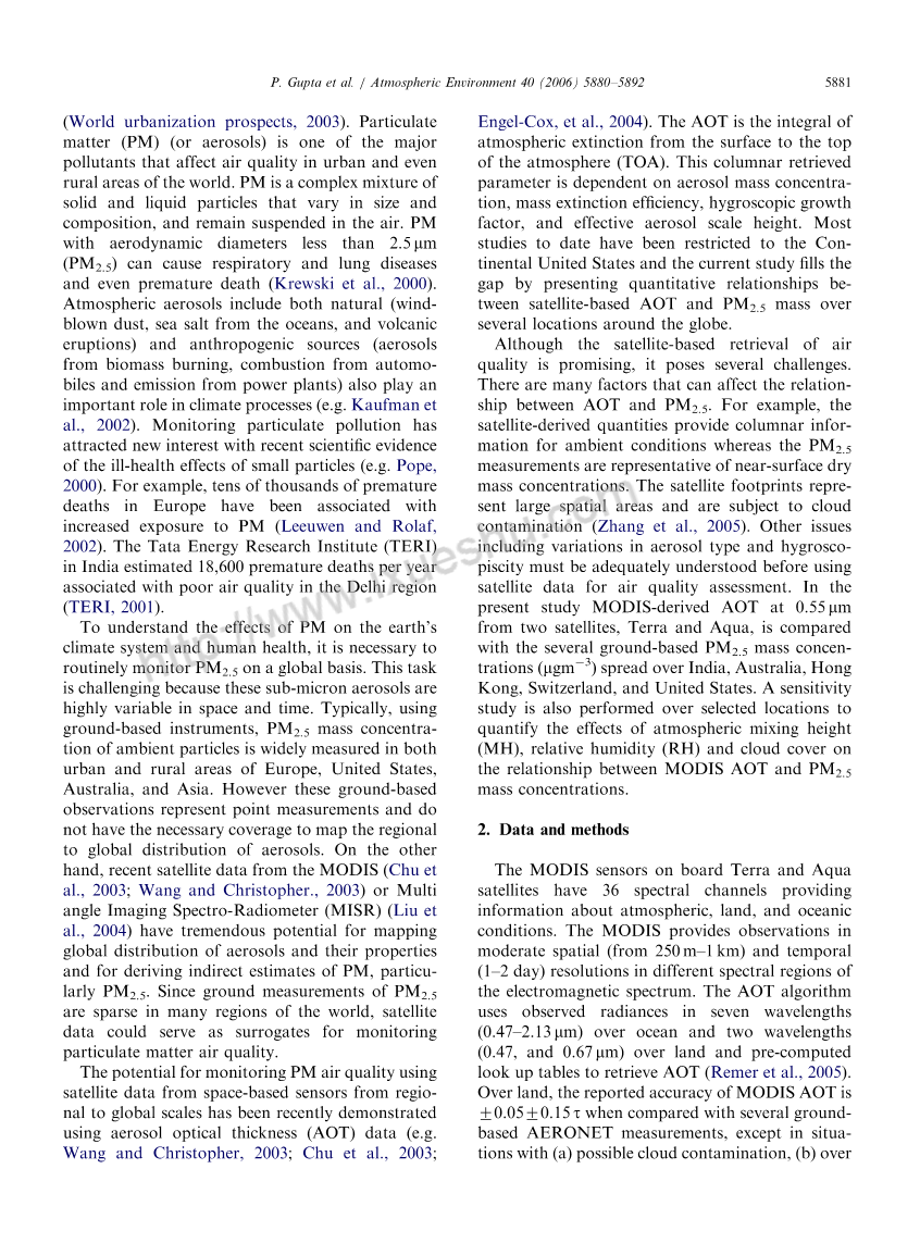 为了了解PM对地球气候系统和人类健康的影响,有必要在全球范围内定期监测PM2.5。这个任务富有挑战性,因为这些亚微米气溶胶在空间和时间上是高度可变的。通常,在欧洲、美国、澳大利亚和亚洲的城市和农村地区,使用地面仪器广泛测量环境颗粒物的PM2.5质量浓度。然而,这些地面观测代表着点的测量,没有必要的覆盖范围来将气溶胶的区域分布映射到全球。另一方面,MODIS最近的卫星数据(Chu et al., 2003; Wang and Christopher., 2003)。或多角度成像光谱辐射计(MISR) (Liu et al., 2004)在绘制全球气溶胶分布及其性质,以及间接估算颗粒物PM2.5方面具有巨大的潜力。由于世界上许多地区对PM2.5的地面测量很少,卫星数据可以作为监测颗粒物空气质量的替代产品。