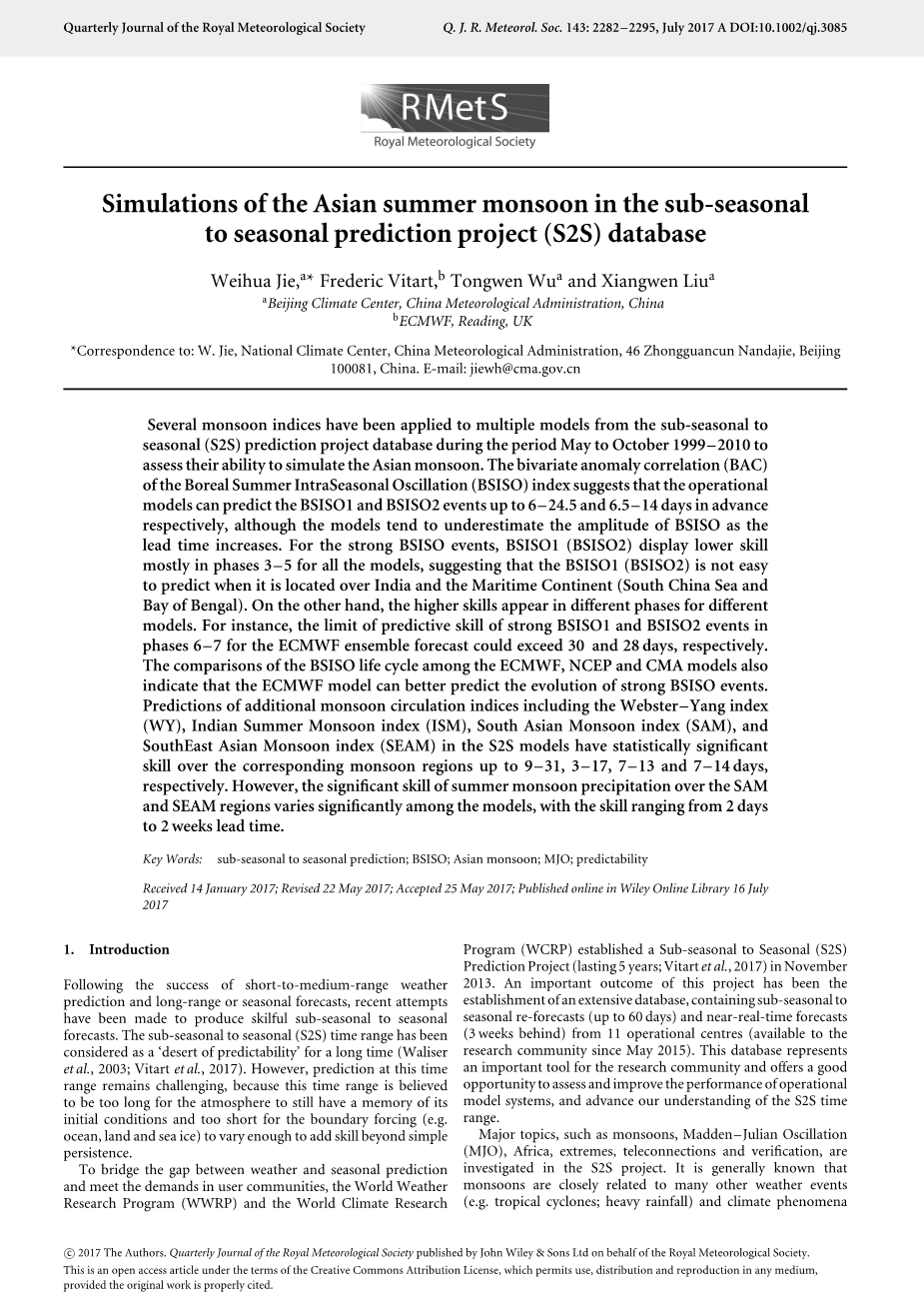 Weihua Jie,a* Frederic Vitart,b Tongwen Wua and Xiangwen Liua