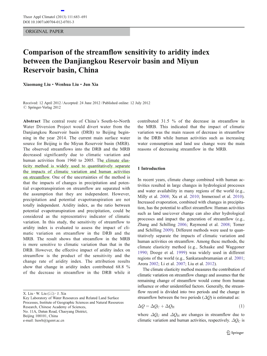 中国南水北调的中心线路将在2014年开始从丹江口水库流域引水到北京。当前北京主要的地表水源是密云水库流域。由于气候变化和人类活动,从1960到2005年间DRD和MRD的入流量有显著的降低。气候的弹性系数法被广泛用于定量分离气候变化和人类活动对径流的影响。这个方法的一个不确定因素是通过假设下渗和潜在蒸散发是相互独立的来分离它们对径流的影响。然而下渗和潜在蒸散发不是完全独立的。干燥指数,即潜在蒸散发和下渗之间的比率,可以看做气候变化的代表性指标。在本研究中,通过评估DRB和MRB中气候对径流的影响来评估径流对干燥指数的灵敏度。结果显示MRB中的径流比DRB中的径流对气候变化更加敏感。然而,干燥指数对径流的有效影响是灵敏度的产物和干燥指数变化率。归因结果显示,干燥指数对径流下降的贡献率在DRB中是68.8%,而在MDR中是31.5%。这表明在DRB中径流下降的主要原因是气候变化的影响,而在MDR中是人类的活动,例如持续增长的用水量和土地利用变化。