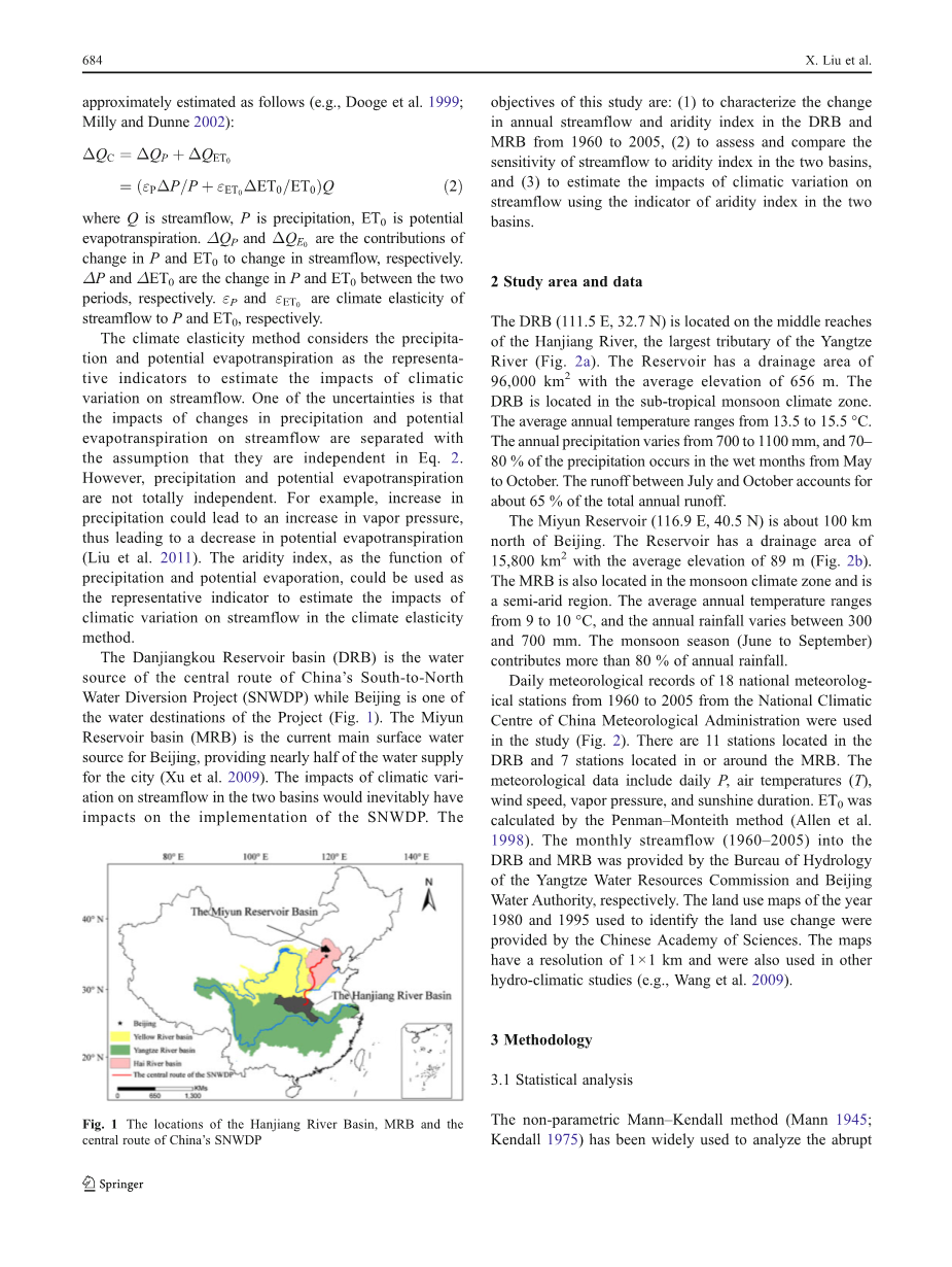 式中Q为径流,P为下渗,ET0为潜在蒸散发,. Delta;Qp和. Delta;Qe0分别为P和ET0的变化对径流变化的贡献,Delta;P和Delta;ET0为P和ET0在两个时期间的变化,εP和εET0是径流分别对P和ET0的气候弹性系数。气候弹性系数法考虑下渗和潜在蒸散发为估计气候变化对径流影响的代表因子。这个方法的一个不确定因素是通过假设下渗和潜在蒸散发的Eq是相互独立的来分离它们对径流的影响。然而下渗和潜在蒸散发不是完全独立的。例如,下渗增加会导致气压增压,从而导致潜在蒸散发下降。干燥指数,作为下渗和潜在蒸散发的结构,可在弹性系数法中作为代表因子来估计气温变化对径流的影响。