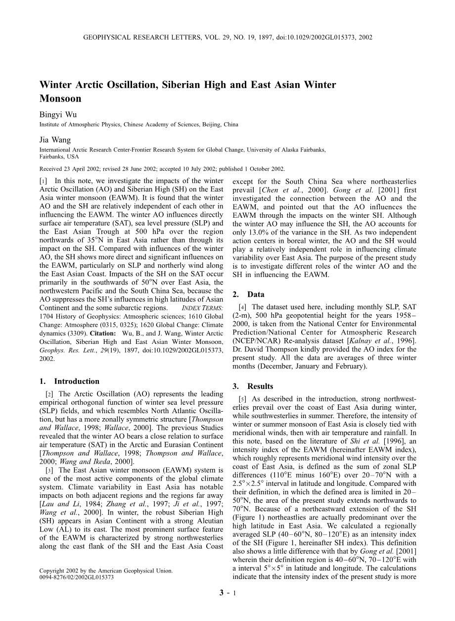 [2]Gong, D. Y., S. W. Wang, and J. H. Zhu, East Asian winter monsoon and Arctic Oscillation, Geophy. Res. Lett., 28(10), 2073–2076, 2001.