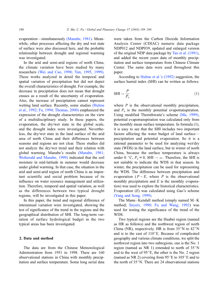 在中国北方的干旱和半干旱地区,气候变化已经被许多研究者(Wei和Cao,1998; Yan,1995,1999)研究过。这些著作详细分析了降水的时空变化,但没有描述干旱的总体特征。例如,降水量的减少并不意味着干旱是由蒸发的不确定性引起的。此外,降水的增加也不能代表润湿的地表。最近,一些研究(Hulme等,1992; Fu,1994; Thomas,2000)强调了干旱特征在多学科研究中的表现。在这些论文中,研究了蒸发、全球范围内的干湿状态和干旱指数。尽管如此,中国北方干旱地区地表干湿状态以及季节和地区之间的差异尚不清楚。这些研究没有分析干湿趋势及其与全球变暖的关系。 Manabe的结果(Manabe,1981; Wetherald和Manabe,1999)表明,在全球变暖的影响下,夏季中纬度地区的土壤水分会减少。在这种情况下,由于其对水资源管理和利用的影响,中国北方干旱和半干旱地区的情况是一个重要的科学和社会问题。因此,本文将研究时间和空间的变化,以及两个典型干旱地区之间的差异。