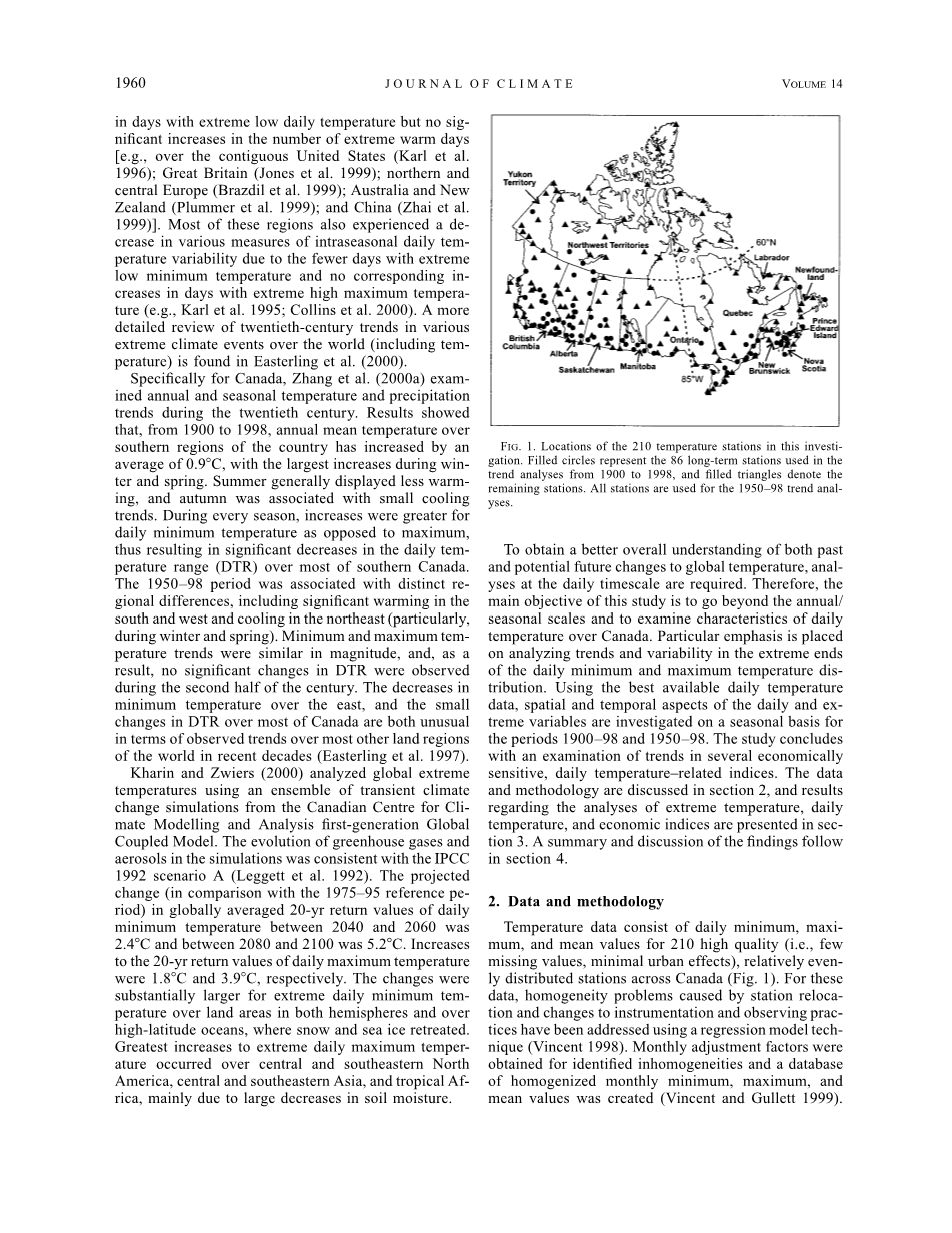 为了更全面地了解过去和未来全球气温的可能变化,需要在每日的时间尺度上进行分析。因此,本研究的主要目的是超越年际/季节尺度,并研究加拿大的日气温特征。特别强调分析日最低和最高气温分布极值的趋势和变化。利用可获得的最佳日气温数据,对1900-1998年和1950-1998年期间的日变量和极端变量的空间和时间方面进行了季节性调查。该研究的结论是对几个经济敏感且与日气温相关指数的趋势进行检查。第2节讨论数据和方法,第3节介绍极端温度、日温度和经济指标的分析结果。总结和讨论结果见第4节。