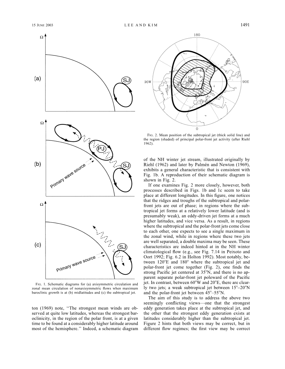 如果有人仔细地检查图2,就会发现无论是和图1b还是图1c描述的过程相比似乎都发生在不同的经度。在这张图中,有人发现副热带急流额极锋急流的槽和脊是不协调的;副热带急流生成的区域纬度相对较低(并且想必较弱),同时涡旋驱动急流产生在一个相对较高的纬度,并且较强。结果,在副热带急流和极锋急流相互靠近的地区,有人期望能看到一个最大的纬向风;而在两种急流相互远离的区域,可能会看到一个双峰。在北半球的气候场确实暗示了这些特点(见图 7.14 in Peixoto and Oort 1992; 图 6.2 in Holton 1992)。更显著的是,在120°E-180°E副热带急流和极锋急流同时发生的区域(图2),有人发现旺盛的太平洋急流中心位于35°N,并且在太平洋急流的边界上没有明显独立的极锋急流。正相反,在60°W和20°E有明显的两个急流,分别是在15°-20°N的弱的副热带急流和45°-55°N处的极锋急流。