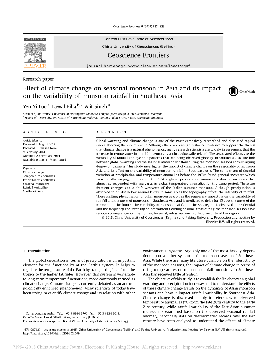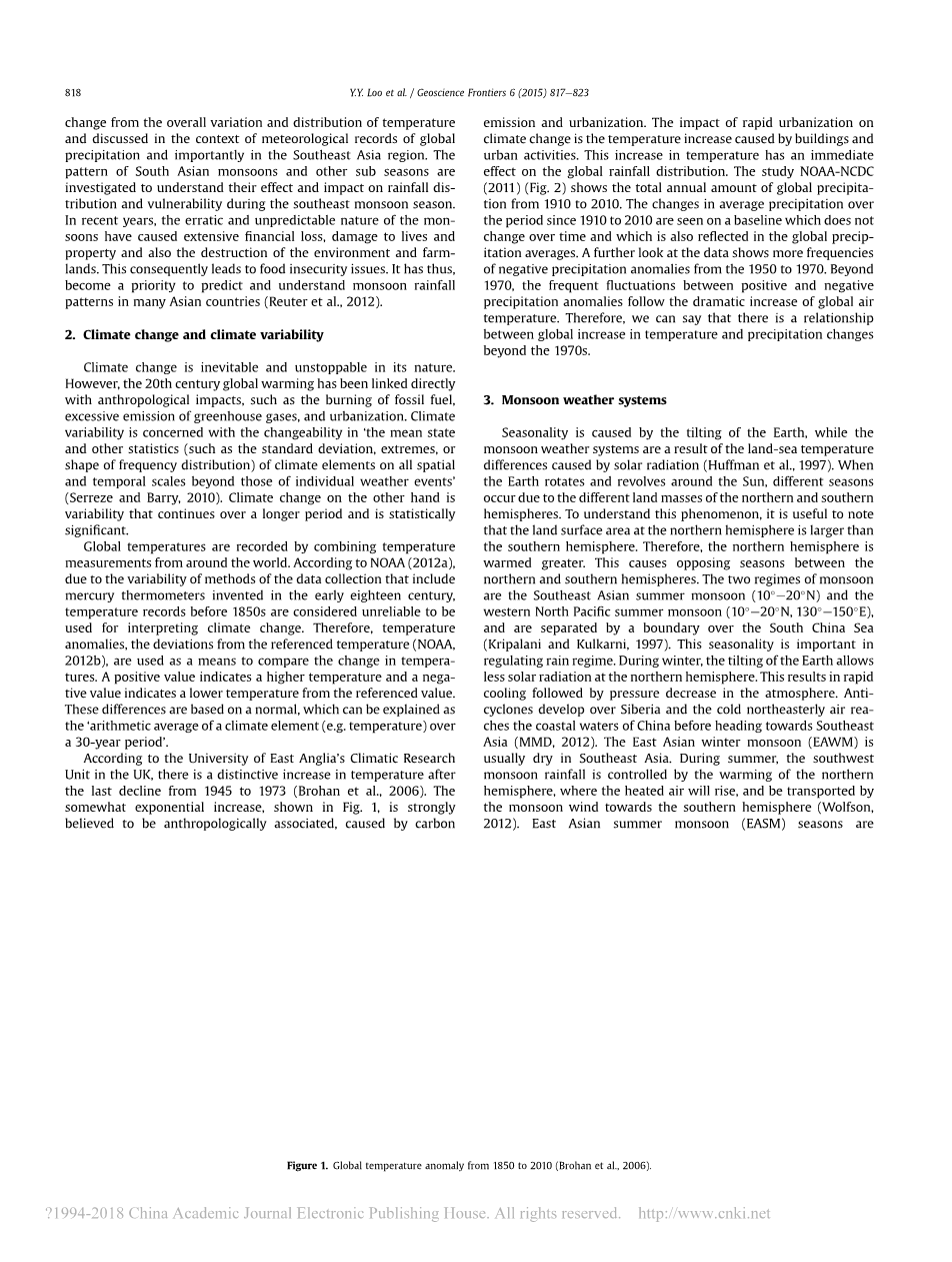 摘要:全球变暖和气候变化是影响环境的研究和讨论中最广泛的主题之一。虽然有足够的历史证据支持气候变化是自然现象的理论,仍有许多研究科学家普遍认为20世纪气温升高与人类学有关。相关的影响是全球范围内观测到的降水和气旋模式的变化。在东南亚,全球变暖与季节性大气环流之间的联系表现出不同程度的模糊性。本研究探讨了气候变化对亚洲季风季节性的影响及其对东南亚季风降水变率的影响。20世纪70年代以前降水和温度异常年代际变化的比较表明,降水和温度异常的年代际变化普遍,且变化较大。但是在20世纪70年代以后,全球降水量异常的增加,与同期全球温度异常的增加几乎一致。 印度夏季风频繁发生变化并向西移动。虽然观测到降水比正常水位低70%,但在一些地区,地形影响降雨强度。该地区其他季风期这种变化影响着东南亚降水的变化和季风的爆发,并预计未来季风的爆发将推迟15天。海洋地区季风降水的变化被认为是年代际变化,季风期部分地区的间歇性洪涝的频率和强度对该地区的人力,财力,基础设施和粮食安全造成严重影响。