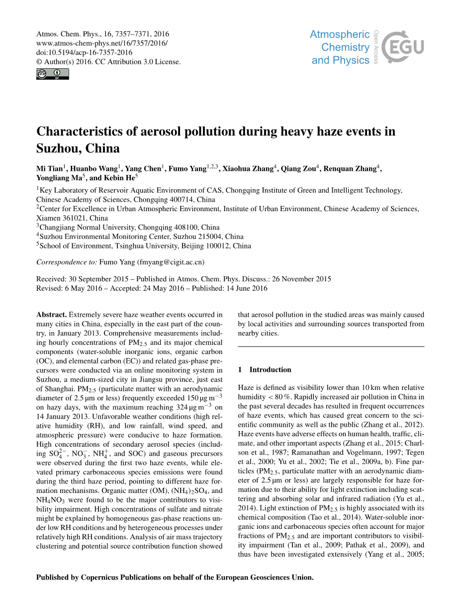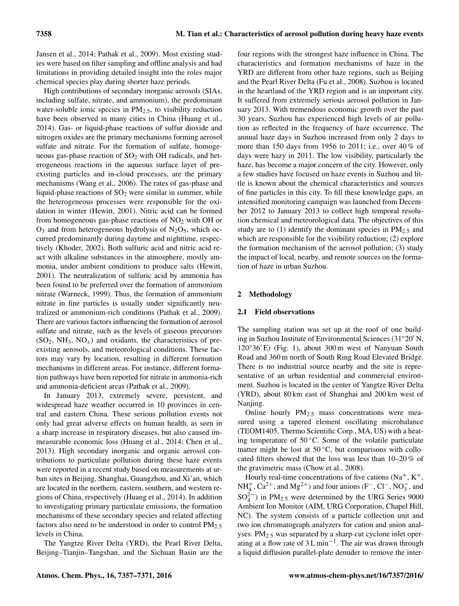 长三角,珠江三角洲,京津唐和四川盆地是中国受雾霾影响最大的四个地区。长三角地区霾的特点和形成机制与北京和珠江三角洲等霾区不同。苏州位于长三角地区的中心地带,是一个重要的城市。2013年1月,苏州就遭受了极端严重的霾污染。随着过去30年里经济的巨幅增长,苏州经历了重度空气污染,这在霾产生的频率上可以体现得出来。从1965年到2011年,苏州每年发生的霾天数从仅仅2天增加到了150天以上,例如在2011年,40%以上的日子里都有霾现象。低能见度,特别是霾现象,已成为苏州市的主要关注点。然而,只有少数研究集中在苏州的雾霾事件,对苏州市的细颗粒的化学特性和来源的研究几乎没有。为了弥补这些知识空白,2012年12月至2013年1月期间开展了加强监测活动来收集高时间分辨率的化学和气象数据。本研究的目的是(1)确定PM2.5中的主导物质,通过主导物质的研究为降低能见度做贡献;(2)探索气溶胶污染的形成机制;(3)研究当地,附近, 和较远地区的资源对苏州市内霾形成的影响。