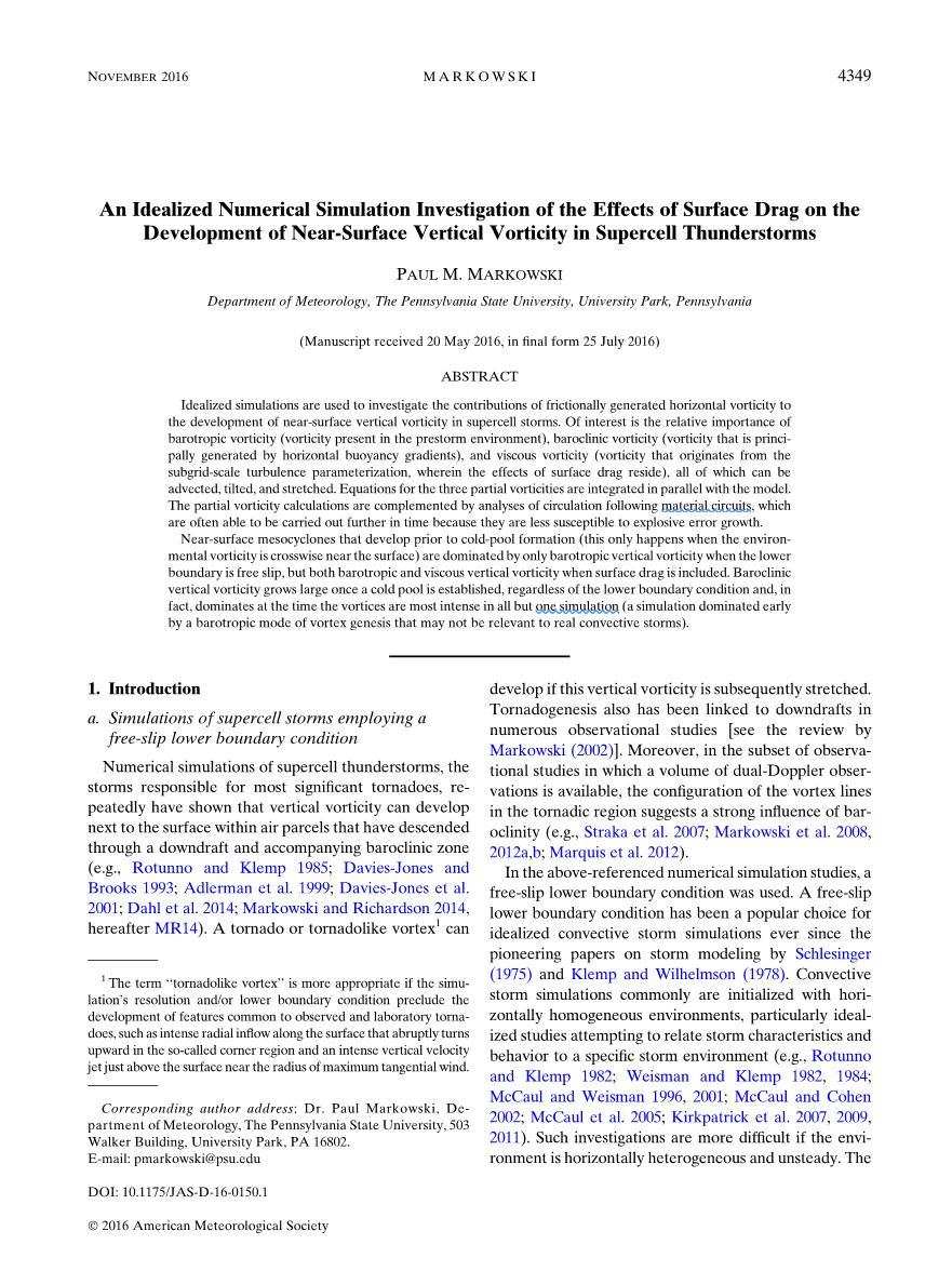 由巨大的龙卷风造成的风暴,超级雷暴单体的数值模拟反复地表明垂直涡度可以在下向气流和伴随着斜压带下降的空气包内表面发展(例如Rotunno和Klemp 1985; Davies-Jones和Brooks 1993; Adlerman等人1999; Davies-Jones等人2001; Dahl et al. 2014; Markowski和Richardson 2014,以下简称MR14)。如果这种垂直涡度随后被拉伸,龙卷风或龙卷风漩涡就可以发展。在许多观察性研究中,龙卷的形成也与下向气流相关[参见Markowski的综述(2002)]。此外,一定量的双多普勒观测在观测研究的子集中是可用的,在龙卷风区域中的涡流线的构造表明了斜压性的强烈影响(例如,Straka等 2007; Markowski等 2008,2012a,b; Marquis等 2012)。