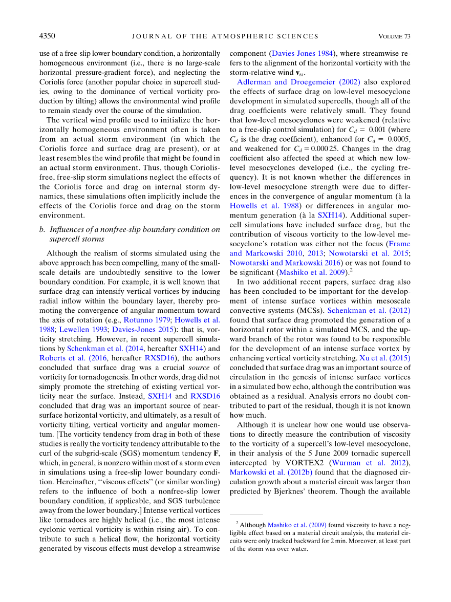 虽然用上述方法模拟风暴的现实已经引人注目,但许多小细节对较低边界条件影响无疑是敏感的。例如,众所周知的是,表面阻力可通过在边界层内诱发径向流入而增强垂直涡度,从而促进角动量朝向旋转轴的收敛(例如,Rotunno 1979; Howells等人1988; Llewellyn 1993; Davies-Jones 2015):即涡旋伸展。然而,在最近Schenkman(2014,以下称SXH14)和Roberts et al(2016,以下称RXSD16)等人的超级单体模拟中,作者得出结论,表面阻力不仅仅是龙卷风涡度发生的一个重要来源,换句话说,阻力还促进了地表附近的现有垂直涡度的拉伸。相反,SXH14和RXSD16得出结论,阻力是近地表水平涡度的一个重要来源,并且最终作为倾斜涡度、垂直涡度和角动量的结果。[这两个研究中涡度阻力趋势实际上是归因于亚格子尺度(SGS)F动量的涡度倾向的卷曲,在大多数风暴中,即使在自由滑动下边界条件模拟中,这种趋势通常也是非零的。在下文中,如果适用的话,“粘性效应”(或类似词语)是指非自由滑动下边界条件和远离下边界的SGS湍流的影响。] 强烈的垂直涡流如龙卷风一样是高度螺旋的(即,气旋的最强烈的垂直涡度处于上升的空气之中)。粘性效应产生的水平涡度必须产生流分量才有助于这样的螺旋流的发展(Davies-Jones 1984),其中流分量指具有风暴相对走向的水平涡度。