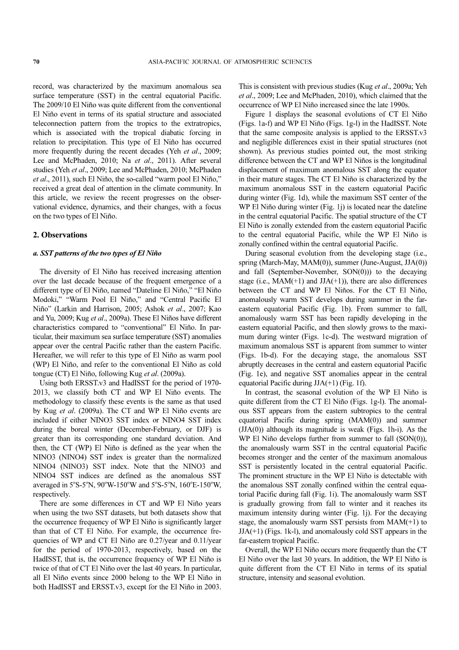 and Yu, 2009; Kug et al., 2009a)。这些厄尔尼诺事件相比于“传统”厄尔尼诺事件有不同的特征。尤其是,其最大海表面温度(SST)异常在出现在太平洋中部,而不是东太平洋。参照Kug 等 (2009a),我们今后将把这种类型的厄尔尼诺称为暖池(WP)厄尔尼诺事件,并称传统的厄尔尼诺事件为冷舌(CT)厄尔尼诺事件。