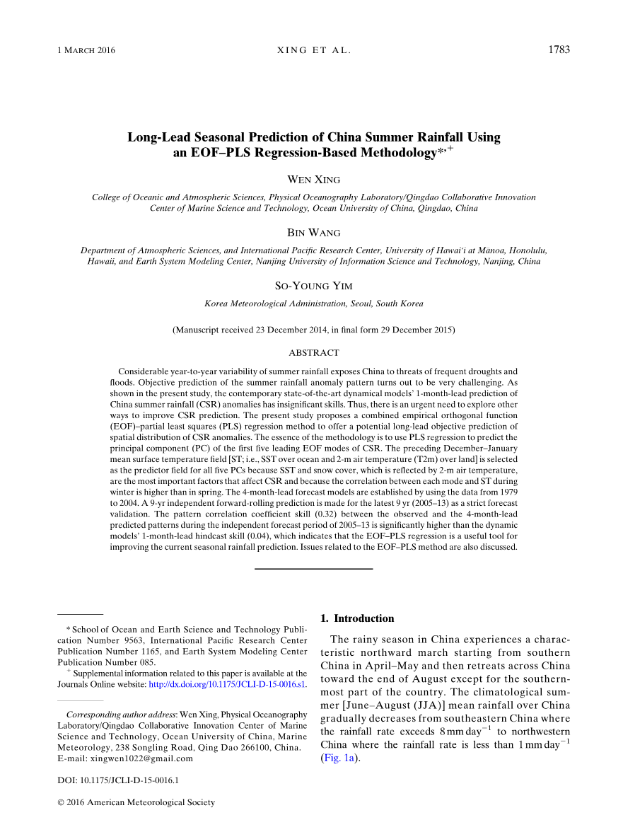 使用一个基于EOF-PLS回归方法的中国夏季降水预测外文翻译资料