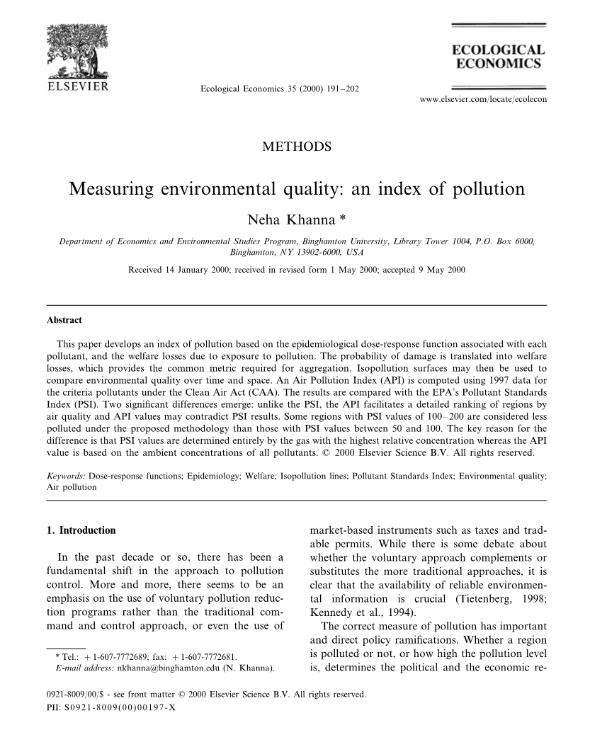 自的物理影响以及随之而来的福利损失的指标。福利损失提供了不同环境指标的环境浓度可以综合为整体污染指数的共同指标。