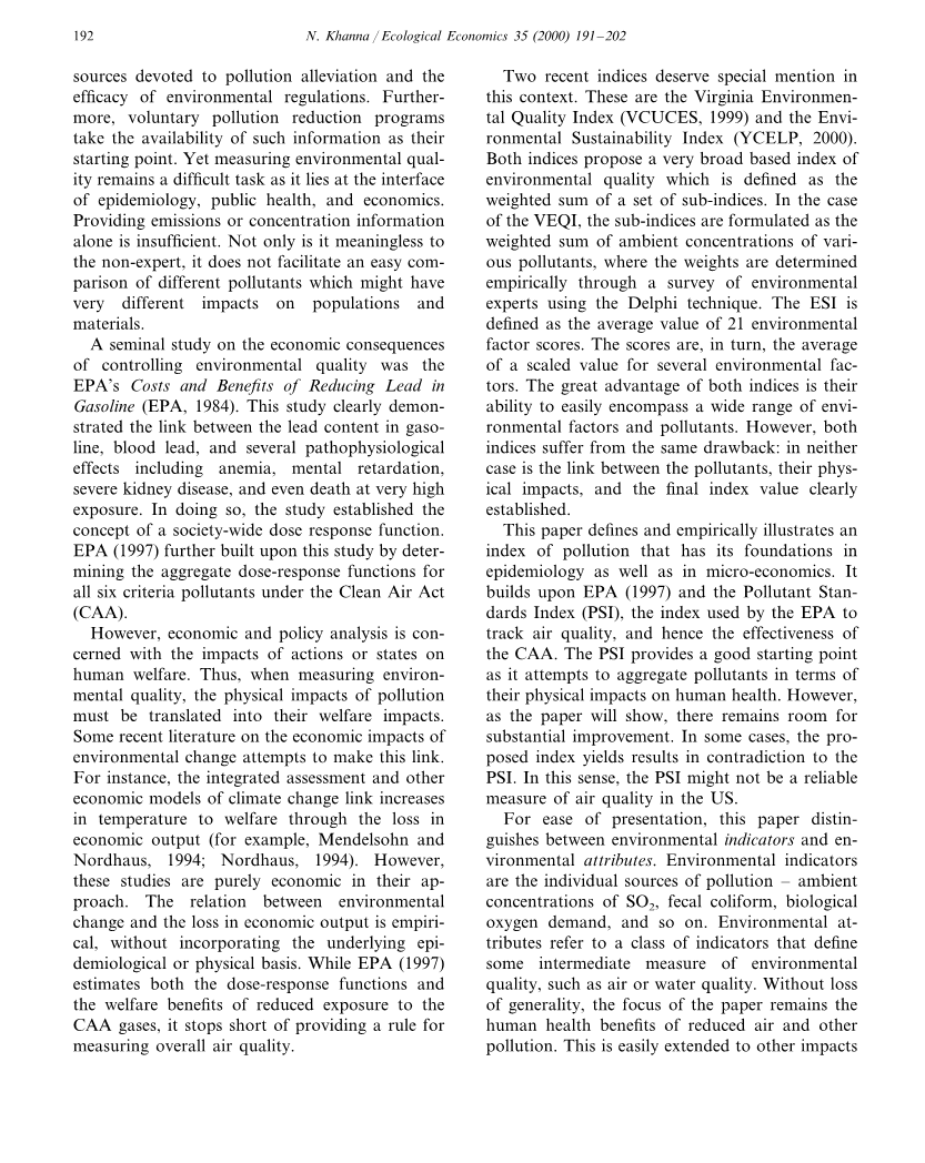 最近的两项指标值得在这篇文章中特别提及,维吉尼亚州环境质量指数(VCUCES,1999)和环境可持续性指数(YCELP,2000)。这两个指数都提出了一个非常广泛的环境质量指数,它被定义为一组子指数的加权和。在VEQI的情况下,分类指数被公式化为各种污染物的环境浓度的加权和,其中权重被环境专家通过使用Delphi技术经验性的确定。ESI被定义为21个环境因子得分的平均值。 发过来,这些分数是几个环境因素的平均值。两个指标的巨大优势是能够容易地包含各种环境因素和污染物。然而,两个指标都有同样的缺点:没有一种情况,污染物之间的联系,物理影响和最终指标值能够明确确定。