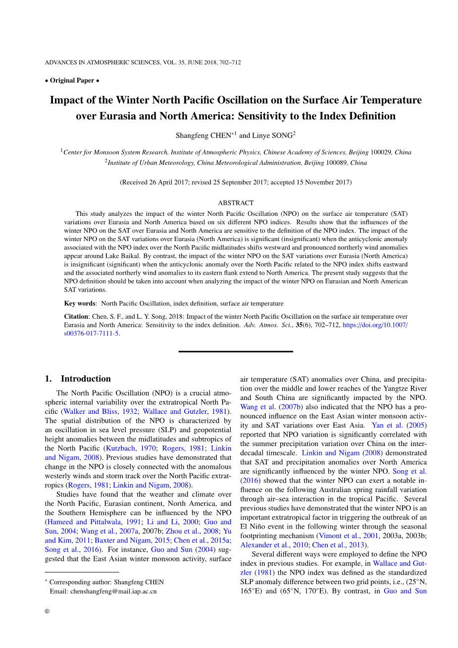 最近的一项研究报告指出,冬季NPO对下一年冬季ENSO活动的影响对NPO指数的定义非常敏感(Chen and Wu,2017)。研究发现,当北太平洋副热带地区的NPO相关气旋异常延伸至赤道附近时,才能获得显着的NPO-El Nino联系。因此,一个自然而然的问题是,冬季NPO对欧亚大陆和北美洲的SAT变化的影响是否对NPO指数的定义也很敏感。考虑到这一点,本研究的主要目标是研究冬季NPO对欧亚和北美SAT的影响对NPO指数的不同定义的敏感性。