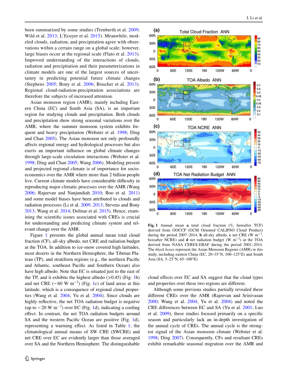 在被大气辐射加热、地表能量平衡、大气环流和降水所影响的地球气候系统的能量和水循环中,云扮演了很重要的角色(Randall et al. 2007;Boucher et al. 2013)。在过去的几十年里,使用卫星观测以及气候模型模拟在研究云物理特性以及它们的气候影响方面做了许多努力(Trenberth et al. 2009;Stubenrauch et al. 2013),尤其是云辐射效应(CREs)(Loeb et al. 2009)。大气层顶(TOA)的云辐射效应代表了云对短波辐射(SW)以及长波辐射(LW)的体效应,同时也是研究云辐射相互作用和诊断气候模型相关问题的有效方法(Ramanathan et al. 1989;Loeb et al. 2012)。降水是水循环的重要象征,因此,CREs与通过大气环流与决定了CREs的云特性的降水有一些潜在的物理关系。目前,全球云辐射平衡的全球示意图已经被一些研究所总结(Trenberth et al. 2013;LEcuyer et al. 2015)。同时,模拟的云、辐射以及降水与在全球规模的一个确定的范围的观察相一致;然而,在一个区域的规模下就有很大的偏差(Flato et al. 2013)。提升对云、辐射和降水的相互作用,以及它们在气候模型方面参数化的理解是在预测潜在的未来气候变化方面最大的不确定因素之一 (Stephens 2005;Bony et al.2013)。区域性的云-辐射-降水的联系因此是需要坚强关注的课题。