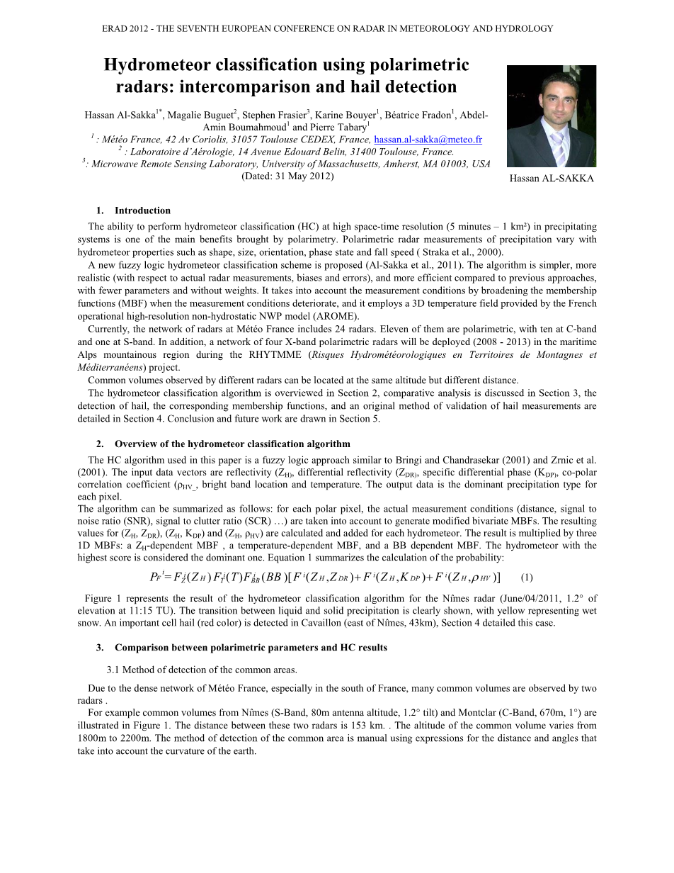 Al-Sakka H., Kabeche F., Figueras i Ventura J., Fradon B., Boumahmoud A. A., and Tabary P. 2011: A simple-but-realistic fuzzy logic hydrometeor classification scheme for the French X, C and S-band polarimetric radars, AMS Radar conf. 2011, USA.