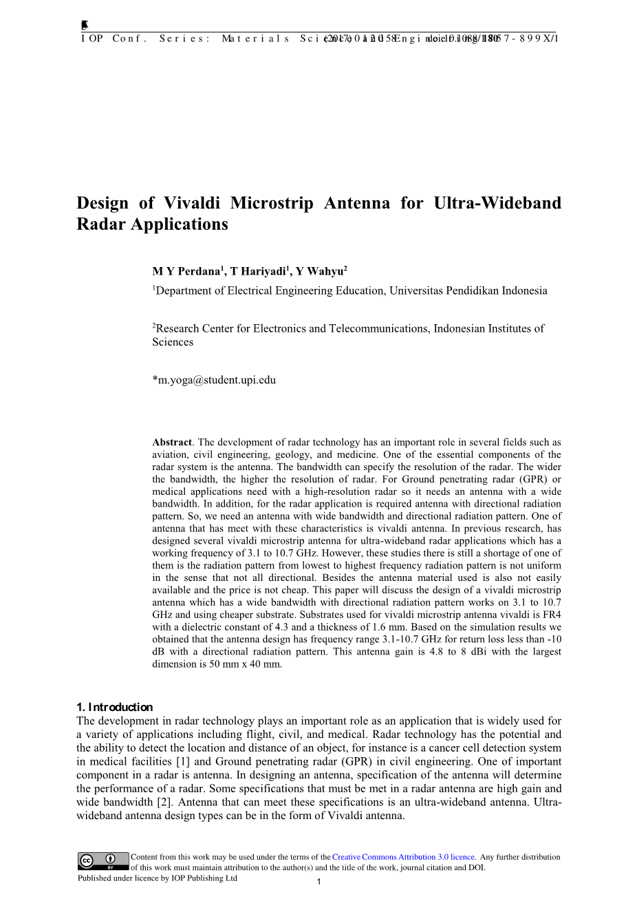 雷达技术的发展起着重要的作用作为一个应用程序,它被广泛用于各种应用,包括飞行中,公民,和医疗。雷达技术有潜力和能力检测对象的位置和距离,例如是癌细胞检测系统在医疗设施中应用[1]和地质雷达(GPR)在土木工程的应用。雷达天线的一个重要组成部分。在设计天线时,天线的规范将确定雷达的性能。一些规范,必须满足雷达天线增益高和宽的带宽[2]。天线能够满足这些规范是一种超宽带天线。超宽频天线设计类型可以是Vivaldi天线的形式。