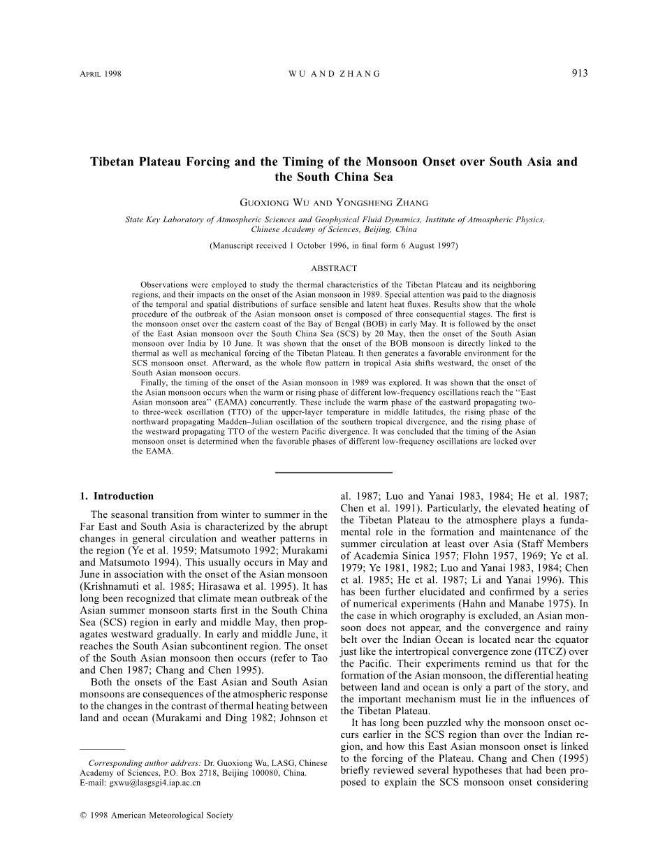 在第2节和第3节,研究了亚洲季风地区陆地和海洋的热量差异的季节性变化。我们还考虑了青藏高原表层显热热通量在季风区的季节性转变中的意义。第4节的重点是在1989年春末夏初西藏高原巨大的显热如何导致在SCS地区南海季风的爆发。我们研究了高原热力和机械强迫的重要性。 在第5节中,通过考虑不同低频振荡在季节性过渡期间的相互作用,我们努力了解各个位置亚洲季风开始的时间。第6节给出了一些结论和讨论。