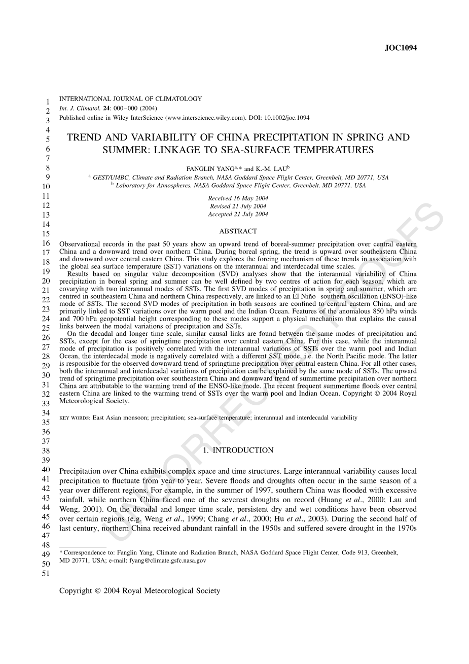 中国春夏季降水趋势及变化特征:与海温的关系外文翻译资料