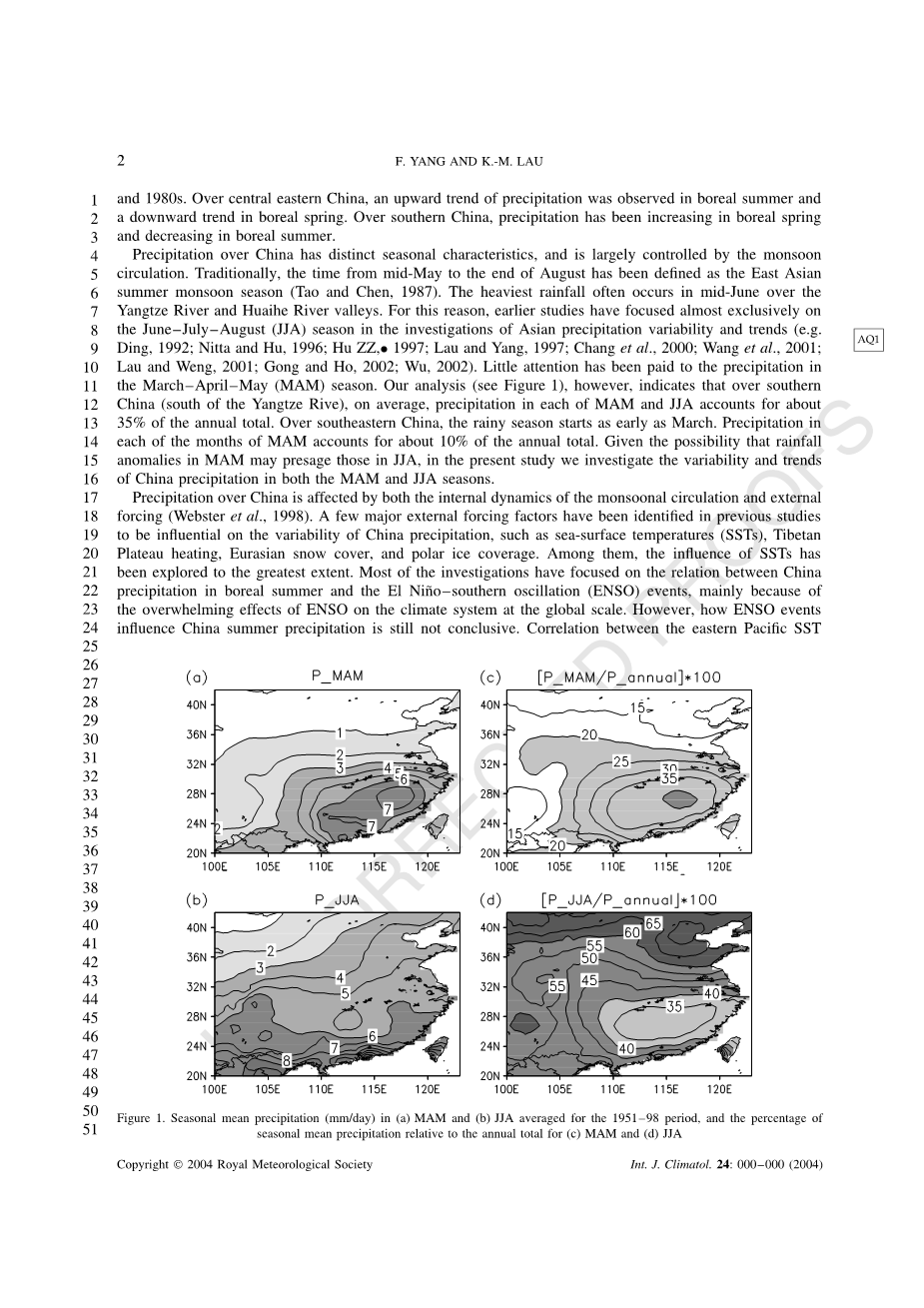 中国的降水具有明显的季节性特征,主要受季风环流控制。传统上,从5月中旬到8月底的时间被定义为东亚夏季风季节(Tao and Chen,1987)。6月中旬降雨量最大的是长江和淮河流域。由于这个原因,早期的研究几乎完全集中在6 - 7 - 8月(JJA)季节,研究亚洲降水变率和趋势(例如Ding,1992; Nitta和Hu,1996; Hu ZZ,1997; Lau and Yang,1997; Chang等,2000; Wang等,2001; AQ1 Lau和Weng,2001; Gong和Ho,2002; Wu,2002)。3月至4-5月(MAM)季节的降水很少受到关注。然而,我们的分析(见图1)表明,在中国南部(长江以南),MAM和JJA的平均降水量约占全年总量的35%。在中国东南部,雨季从三月份开始。MAM每个月的降水量约占全年的10%。鉴于MAM降水异常可能预示着JJA降水异常,本研究调查了MAM和JJA季节中国降水的变率和趋势。