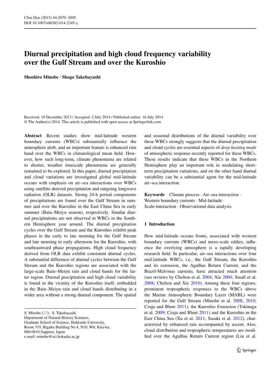 摘要:最近的研究表明,中纬度西边界流(WBCs)能够显著地影响其上空的大气,其中一个很重要的特点是在气候平均场上,这些WBCs上空存在着加强了的雨带。然而,这种长期的气候现象与短期的天气现象有何联系仍有待探索。在这篇文章中,使用卫星反演的降水资料和对外长波辐射(OLR)数据集来研究全球中纬度海洋的降水日变化和云的日变化,重点强调中纬度西边界流区的海气相互作用。在夏季墨西哥湾流区和初夏(梅雨季)东海黑潮区分别发现了降水变率具有较强的24小时分量。在南半球全年的中纬度西边界流上没有发现相似的降水日变化。在墨西哥湾流和黑潮均表现有降水日循环的峰值位相,在墨西哥湾流峰值出现在清晨到上午,在黑潮区降水峰值出现在上午至午后的时段,并且峰值位相向东南方向传播。基于OLR资料的高云频率表现出与降水一致的日循环特征。墨西哥湾流区与黑潮区降水日循环的显著差异与黑潮区存在大范围的梅雨雨带和云带有关。降水和高云的日变化仅出现在黑潮附近,然而更大范围的梅雨雨带和云带没有呈现出明显的日变化特征。中纬度西边界流区云雨日变化的空间分布和季节分布表明,日循环是大气对这些WBCs深加热响应模态的一个重要方面。这些结果表明北半球中纬度西边界流在调节短期降水变率方面发挥着重要的作用,另一方面,日变化也是中纬度海气相互作用的重要组成部分。关键词:气候过程bull;海气相互作用bull;中纬度西边界流bull;尺度影响bull;观测数据分析1、 引言中纬度的海洋是如何与西边界流和中尺度涡旋相联系,进而影响上空大气是一个快速发展的研究领域。特别是在以下四个地区上的海气相互作用,即中纬度西边界流,墨西哥湾流,黑潮和它的延伸区,Agulhas回归潮流和巴西 - 马尔维纳斯群岛的潮流引起了很多关注(见Chelton et al.2004; Xie 2004; Small et al.2008; Chelton和Xie 2010)。 在这四个地区中,突出了对流层对海洋大气边界层(MABL)上的中纬度西边界流的反应,在墨西哥湾流(Minobe et al.2008,2010;Czaja和Blunt 2011),黑潮延伸区域(Tokinaga等人.2009年; Czaja和Blunt 2011)和东海黑潮(Xu et al.2011; Sasaki et al.2012)均有此现象,特点是降水伴随着上升而增强。并且,云分布和对流层温度在阿古拉反流地区都有所改变(Liu et al.2007; Shimada and Minobe 2011)。然而,这些研究主要研究季节或年平均气候。在时间平均场中发现的大气反应必须在更短的时间尺度上涉及时间变化的现象。降水尤其如此,因为它的发生与较短的时间尺度现象,如天气尺度干扰和日变化有着高度的关联。大多数以前的研究是关于短期气候现象与中纬度西边界流的海洋相互作用,聚焦于天气尺度变化。天气尺度扰动改变中纬度西边界流区域的海气热通量,这在观察(例如,Alexander和Scott 1997;Zolina和Gulev 2003;萨满等人.2010; Rudeva和Gulev 2011)以及建模研究(例如Nonaka等人.2009年; Taguchi等人2009年; Brayshaw等人2011)均有发现。显热和潜热通量在保持地面斜压状态非常重要(例如,霍斯金斯和巴尔德斯1990; Nakamura et al。 2004年,2008年)对于温带循环的发展也是至关重要的(Hoskins等1985),因此对于确定风暴的性质轨迹也很重要。(例如,Inatsu等2003; Inatsu和Hoskins 2004;Brayshaw等人2008年,2011年; Ogawa等人2012)。尤其是,表面风暴轨迹和高风分布受中纬度西边界流强烈影响(Sampe和Xie 2007; Joyce等人。 2009年; Booth等人2010),并且与降水有关的大气潜热对于中纬度西边界流区域上的旋风发展起着至关重要的作用(例如,Kuo et al.1991; Kuwano-Yoshida et al. 2010; Booth等人2012)。此外,Nakamura等人的观察研究(2012)显示冬季温带气旋的轨迹被日本南部区域黑潮的大转折所影响,这由Hayasaki等人(2013年)在数值实验中得到了证实。 与天气尺度的大量工作相比较而言,西边界流的海气相互作用和日变化的研究较少,大多数关于降水日循环的研究集中在对地面日变化(例如,华莱士1975; Oki和Musiake,1994)或热带地区日变化的关注上(例如Janowiak等人。1994; Yang和Slingo 2001; Nesbitt和Zipser2003; 菊池和王2008),可能反映了早期数据研究的可用性以及在陆地或热带地区出现强烈的日变化的整体趋势。但是,可以看到一个相对较强的日降水循环发生在全球的墨西哥湾流域分析(图2在菊池和王2008)或在区域分析中集中在北美(图6在Dirmeyer等人2012)在夏天,虽然对墨西哥湾流日降水可能的影响在这些文章中没有提及,但是在墨西哥湾流的云日变化在十年前就由Alliss和 Raman (1995)研究过,他们对墨西哥湾西部的分析使用六小时分析,这是粗略的抽样比较,因此与最近的研究中使用三小时的数据进行分析相比,他们的分析是局限的,。