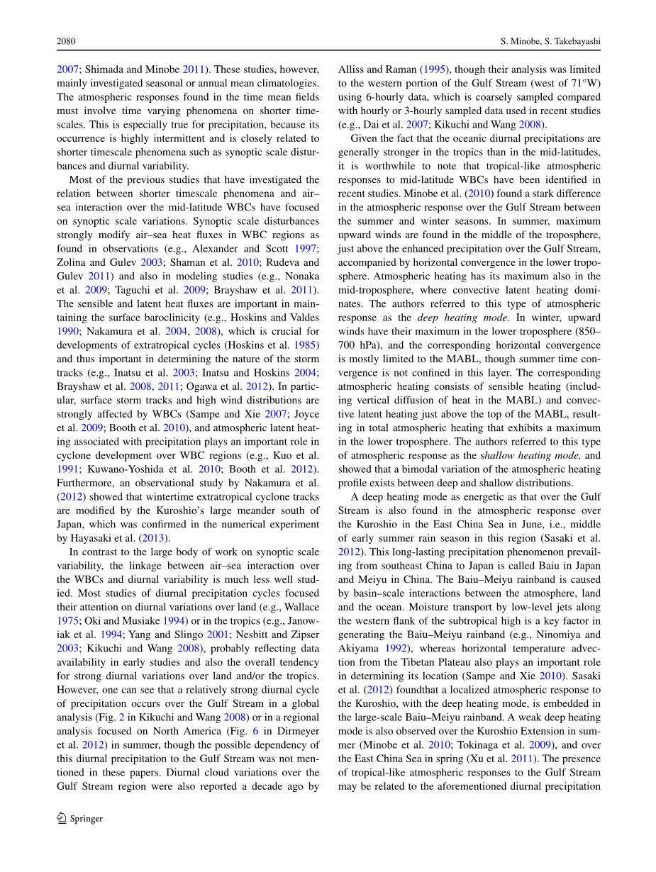 鉴于海洋上的日降水在热带地区要强于中纬度地区,值得关注的是用热带大气来反应中纬度的西边界流已经被纳入近期的研究中。Minobe 等人(2010)发现了在冬夏季节的墨西哥湾流对大气的响应存在很大差异。在夏天,在对流层中部有最强的上升运动,恰好在墨西哥湾流降水加强的上方,伴随着对流层底层的水平辐合。在对流层中部,大气加热也存在最大值,对流潜热占主导地位。作者认为这种类型的大气是对深加热模式的响应。在冬天,上升运动在对流层低层有最大值(850-700 hPa)以及相应的水平辐合,大多发生在于MABL,尽管夏季不局限于这一层。相应的大气加热包括显热(包括在MABL中的热量垂直扩散)和对流潜在的加热刚好在MABL的顶部,导致在总的大气加热中在对流层低层表现出最大值。作者认为这种类型的大气是对浅层加热模式的大气响应,显示出在浅深分布之间的大气加热的双峰变化轮廓。