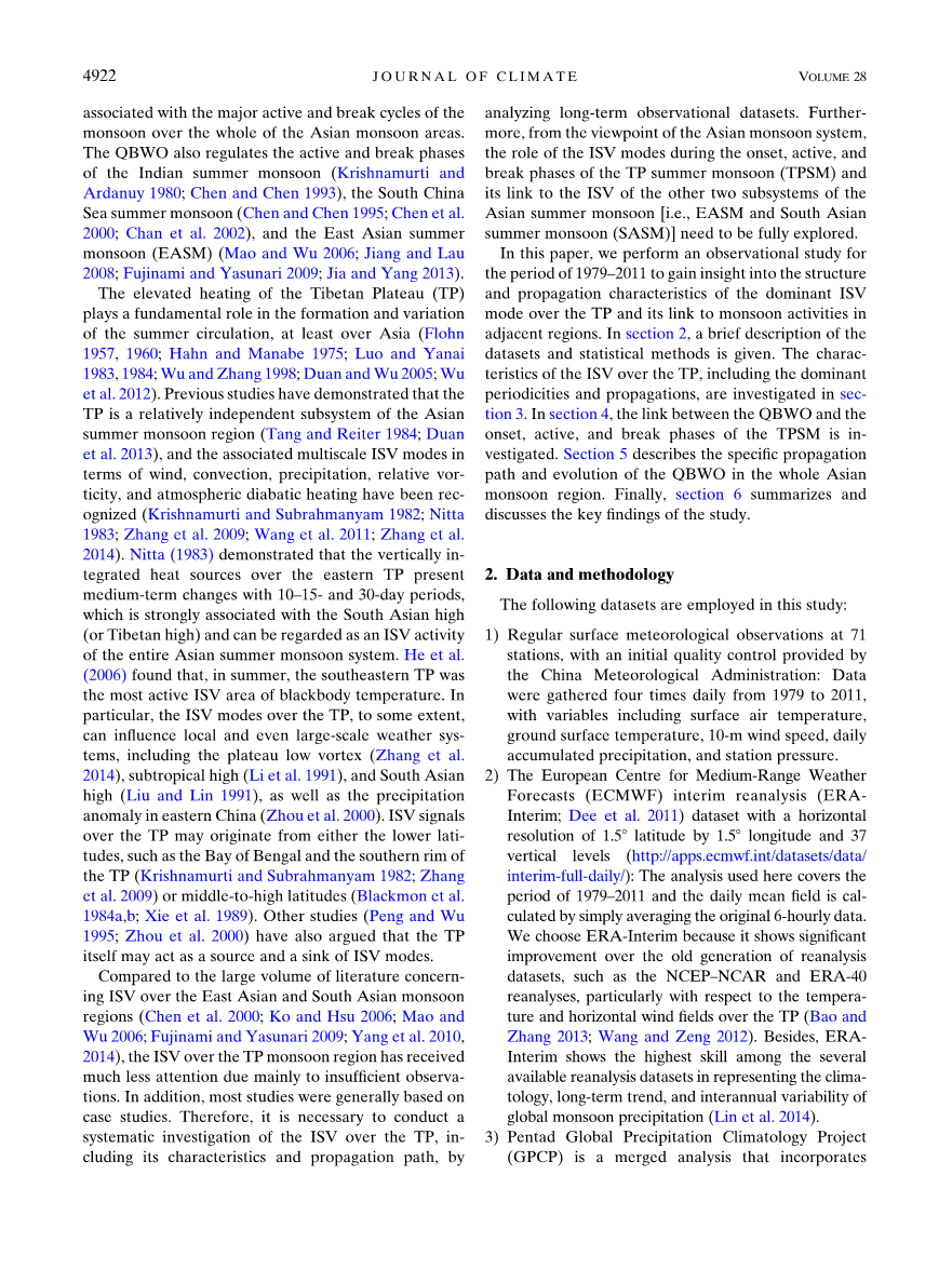 众所周知,亚洲夏季风的活跃和中断受季节内变化作用。Yasunari(1979,1980)发现40天的波动与整个亚洲季风地区季风循环的活跃和中断密切联系。准双周振荡调节印度夏季风(Krishnamurti and Ardanuy 1980;Chen and Chen 1993),中国南海夏季风(Chen and Chen 1995;Chen et al. 2000;Chan et al. 2002)和东亚夏季风(EASM)( Mao and Wu 2006; Jiang and Lau 2008;Fujinami and Yasunari 2009;Jia and Yang 2013)的活跃和中断。青藏高原(TP)不断增强的加热作用在亚洲地区(Flohn 1957;1960;Hahn and Manabe 1975;Luo and Yanai 1983,1984;Wu and Zhang 1998;Duan and Wu 2005;Wu et al. 2012)夏季循环的形成和变化中起主要作用。已有的研究证明,青藏高原针对亚洲夏季风区(Tang and Reiter 1984;Duan et al. 2013)是相对独立的子系统,中尺度季节内振荡模式与风、对流、降水、相对涡度及大气非绝热加热的联系已经被明确(Krishnamurti and Subrahmanyam 1982;Nitta 1983;Zhang et al. 2009; Wang et al. 2011;Zhang et al. 2014). Nitta (1983)证明:青藏高原东部的垂直综合热源表现出10-15天和30天的中时间尺度变化,此与南亚高压(青藏高压)密切相关,并且被认为是整个亚洲夏季风系统的一次季节内活动。He et al.(2006) 发现夏季,青藏高原东南部是黑体温度季节内变化最活跃的地区。特别地,高原上的季节内变化模式在某些程度上,可以影响本地甚至大尺度天气系统,包括高原低涡(Zhang et al. 2014)、亚热带高压(Li et al. 1991)、南亚高压(Liu and Lin 1991)和中国东部异常降水(Zhou et al. 2000)。青藏高原上的季节内变化信号从较低纬度例如孟加拉湾、青藏高原的南部边缘(Krishnamurti and Subrahmanyam 1982;Zhang et al. 2009)或者中高纬度地区(Blackmon et al. 1984a,b;Xie et al. 1989)产生。其它一些研究(Peng and Wu 1995;Zhou et al. 2000)认为,高原本身可以作为季节内变化模式的源和汇。与东亚和南亚季风区(Chen et al. 2000;Ko and Hsu 2006;Mao and Wu 2006;Fujinami and Yasunari 2009;Yang et al. 2010,2014)的季节内振荡有关的大量文献相比较,青藏高原季风区的季节内振荡主要由于没有有意义的观测资料,使其获得的关注较少。因此,有必要通过分析长期的观测数据对青藏高原的季节内变化进行系统的调查研究,包括其特征和传播路径。此外,从亚洲季风系统的观点来看,季节内变化模式在高原夏季风的开始、活动和中断过程中扮演的角色和它与其它两个亚洲夏季风子系统季节内变化的联系需要系统的进行仔细的探索。