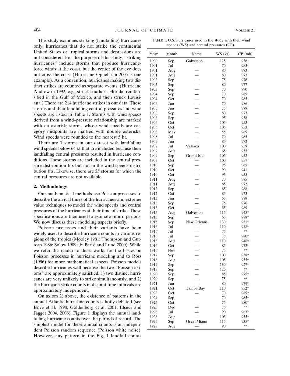 本研究仅估算袭击(登陆)美国大陆的飓风,不考虑不袭击美国大陆或热带风暴以及洼地的飓风。为了本研究的目的,“袭击美国大陆的飓风”包括在海岸产生飓风风的风暴,但飓风眼的中心不通过海岸(2005年飓风奥菲莉亚就是一个例子)。作为一项惯例,进行两次不同袭击的飓风被视为单独的事件。(例如1992年的安德鲁飓风,袭击了佛罗里达州南部,在墨西哥湾重新加强,然后袭击路易斯安娜。)我们的数据中有214次飓风袭击。表1列出了这些风暴及其登陆的中心气压和风速。从风压关系推出的风速标有星号,风速在类别中点的风暴标有双星号。风速四舍五入至最接近的5 kt。