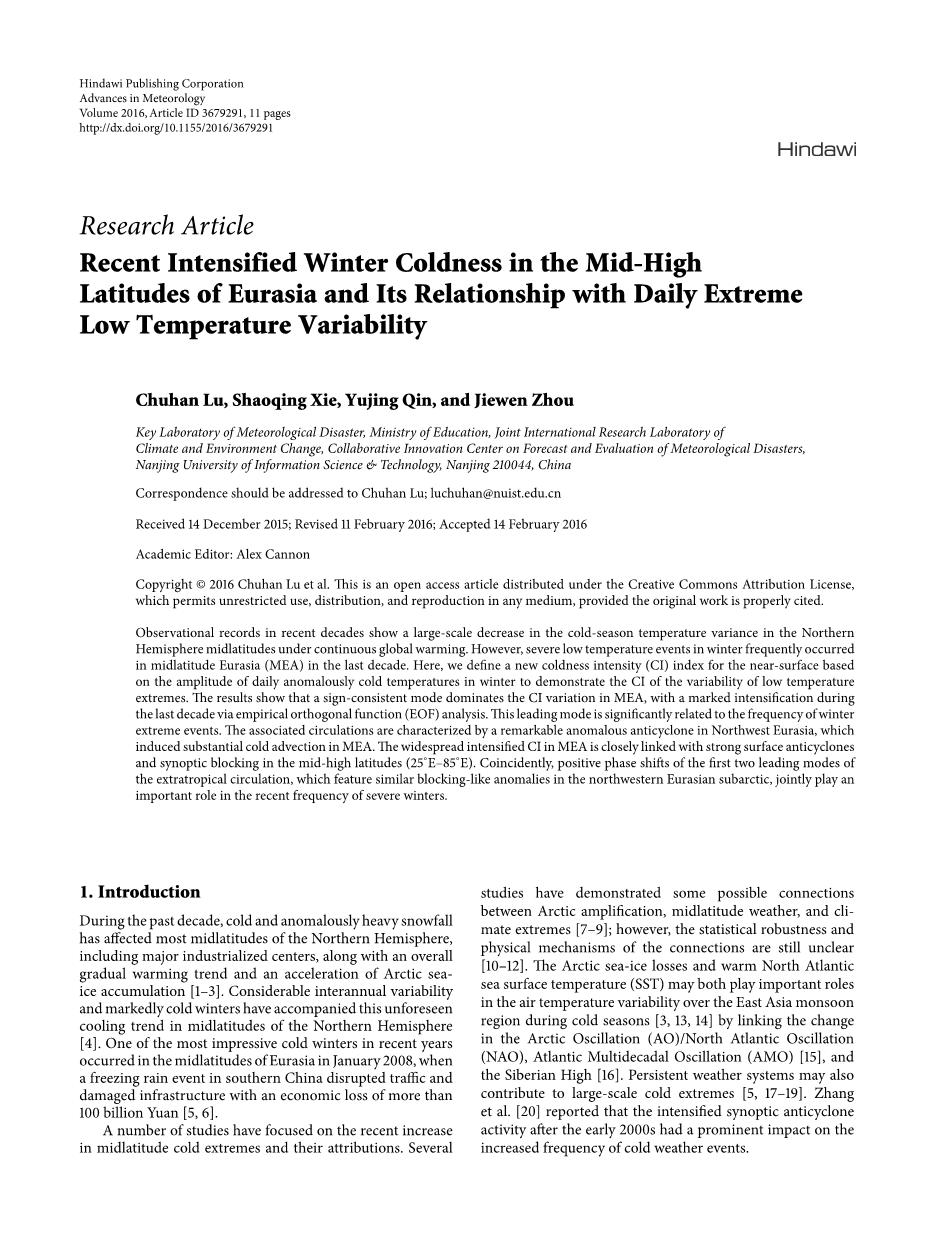 一些研究集中在最近中纬度极端事件的增加及其归因。 一些研究已经证明了北极放大,中纬度天气和极端气候之间的某些可能联系[7-9];然而,联系的统计稳定性和物理机制仍不清楚[10-12]。在寒冷季节,北极海冰的损失和北大西洋暖表面温度(SST)可能在冷的季节对东亚季风区的气温变化起到重要作用[3,13,14],通过联系北极涛动 (AO)/北大西洋涛动(NAO),大西洋多年代振荡(AMO)[15]和西伯利亚高压[16]的变化。持续的天气系统也可能导致大范围的极端寒冷[5,17-19]。 Zhang等人 [20]报道说,2000年初Shadapinent风暴后,天气尺度的反气旋的活动加剧,对寒冷天气事件的频率增加有很大的影响。