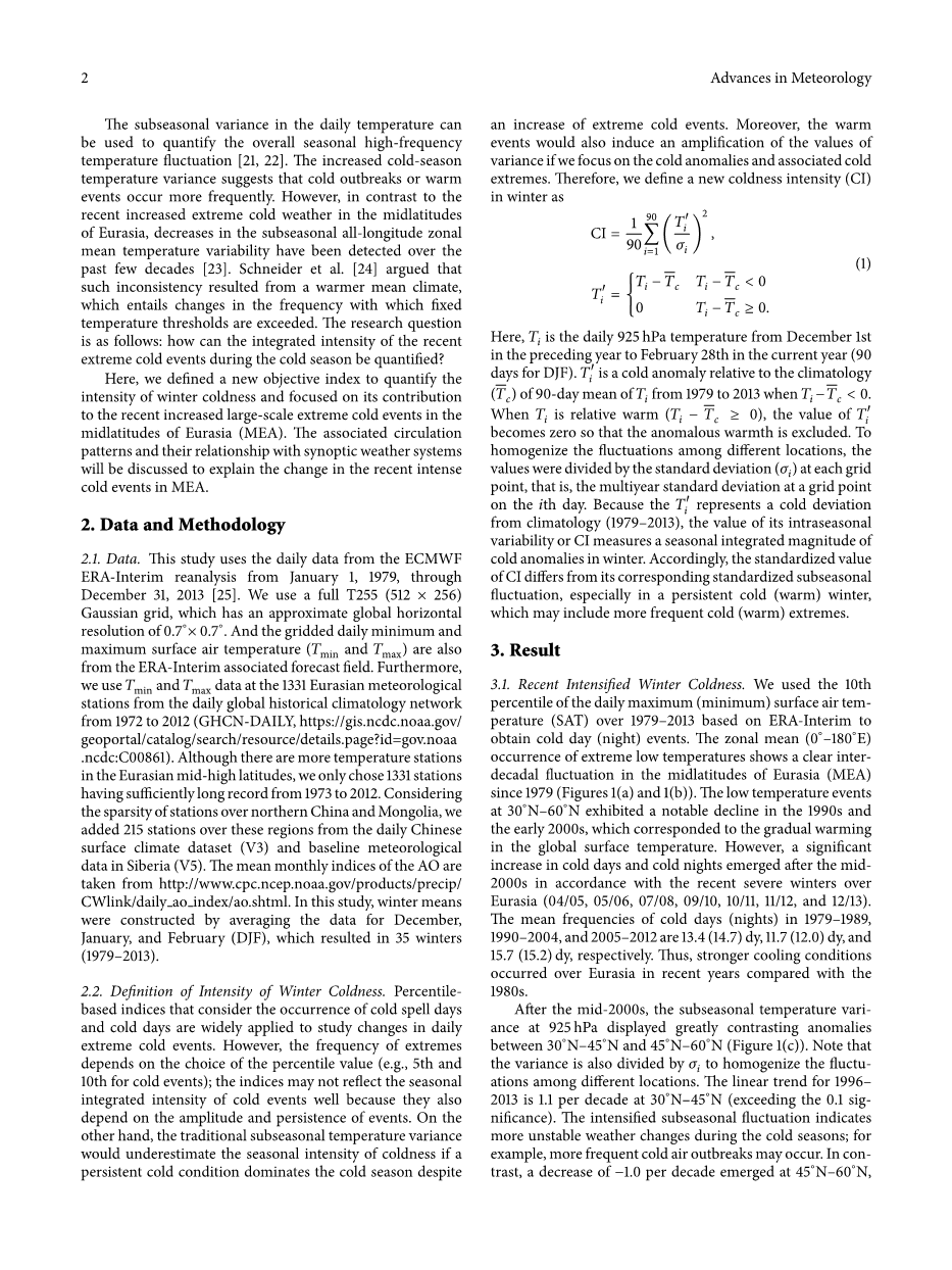 考虑到寒冷天和冷天出现的以百分点为基础的指数被广泛应用于研究日常极端寒冷事件的变化。 然而,极端事件的频率取决于百分位值的选择(例如,第5次和第10次事件);这些指数可能不能很好地反映冷事件的季节综合强度,因为它们也取决于事件的幅度和持续性。另一方面,如果持续寒冷的天气在寒冷季节占主导地位,尽管极端寒冷事件会增加,这时传统的季节温度变化会使寒冷季节的强度偏低。 此外,如果我们关注冷异常和相关的极端事件,温暖事件也会导致方差值的放大。因此,我们将冬季新的寒冷强度(CI)定义为