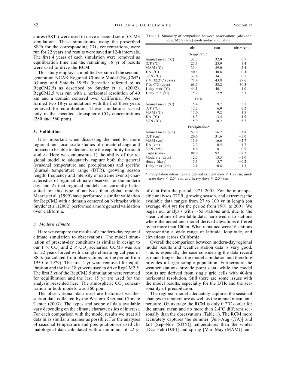 当我们讨论在更多的区域和地方进行对气候变化和影响的尺度研究,才能够证明这种研究的能力时,这种验证是很重要的。我们证明(1)区域模型能够充分获取现代区域性气候的一般的数据(温度和降水)和特定的数据(日间温度范围(DTR),生长季节长度,极端事件的频率和强度)特征,以及(2)目前区域模型比全球模型更适合这种类型分析。其中 Mearns et al(1999)在Nebraska为中心的区域对RegCM2进行了类似的验证,而Snyder等人 (2002)对加利福尼亚进行了更一般的验证。