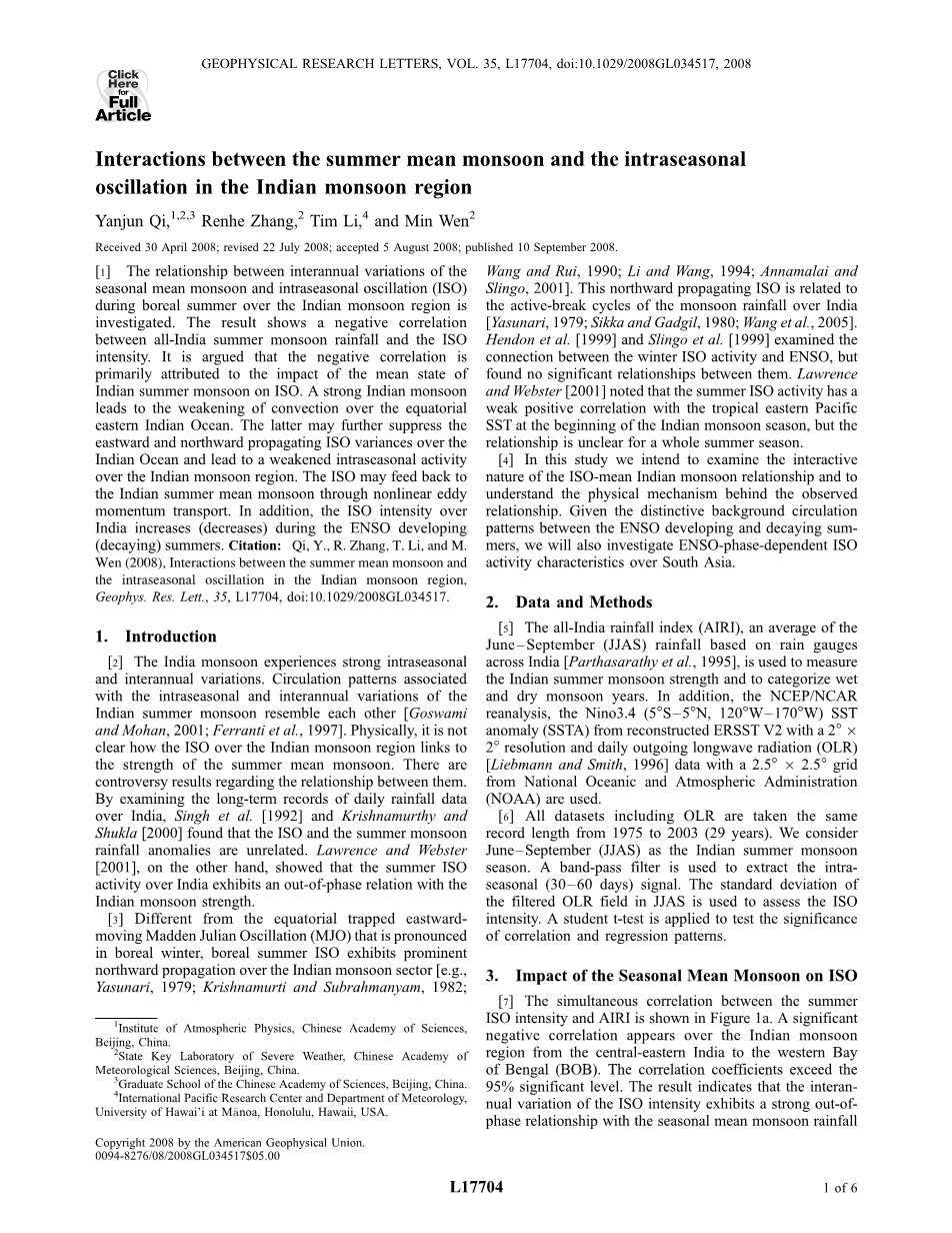 和冬季制约在赤道附近的东移MJO活动不同,北半球夏季在印度季风区有显著的北移特征[e.g., Yasunari, 1979; Krishnamurti and Subrahmanyam, 1982; Wang and Rui, 1990; Li and Wang, 1994; Annamalai and Slingo, 2001]。北传的ISO和印度季风降水的爆发和撤退相关[Yasunari, 1979; Sikka and Gadgil, 1980;Wang et al., 2005]。Hendon et al. [1999] and Slingo et al. [1999]计算了冬季ENSO和ISO的关系,但是并没有发现显著的相关性。但Lawrence and Webster [2001]夏季ISO活动和赤道东太平洋海温在印度季风季开始时有弱正相关关系,但整个夏季的的关系不清晰。