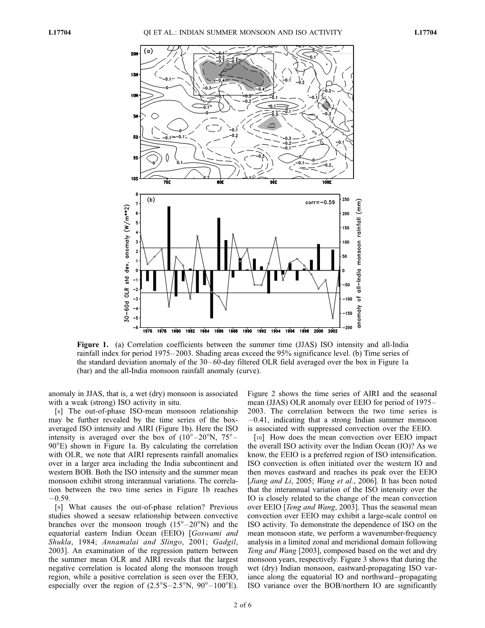 运用OLR和印度季风数据,计算1975-2003年间夏季平均季风强度的季节变化和印度季风区ISO的强度的关系,我们可以发现存在着很强的负位相关系。